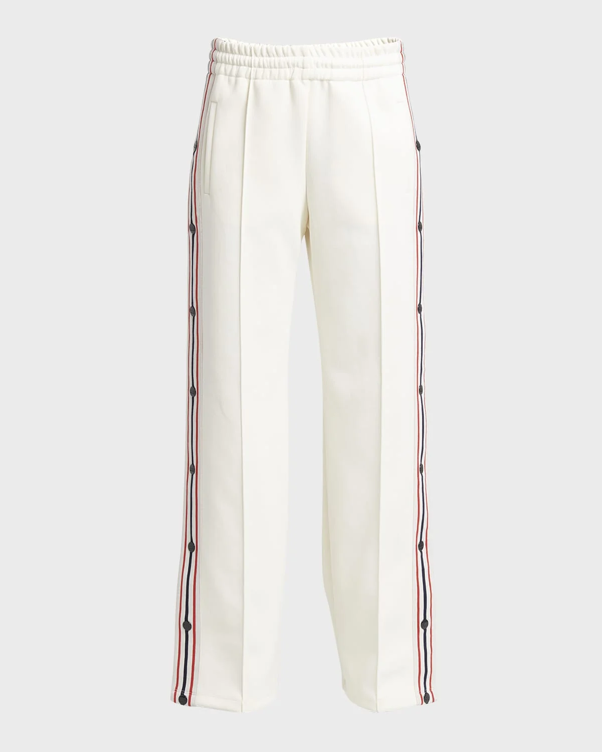 Golden Goose "Star" wideleg joggers featuring contrast tape paneling with snaps in a polycotton fabric High rise; pintuck front Elasticated waistband Side slip pockets; single back pocket Relaxed fit Full length Pullon style Polyester Dry clean, wash inside out Made in Italy