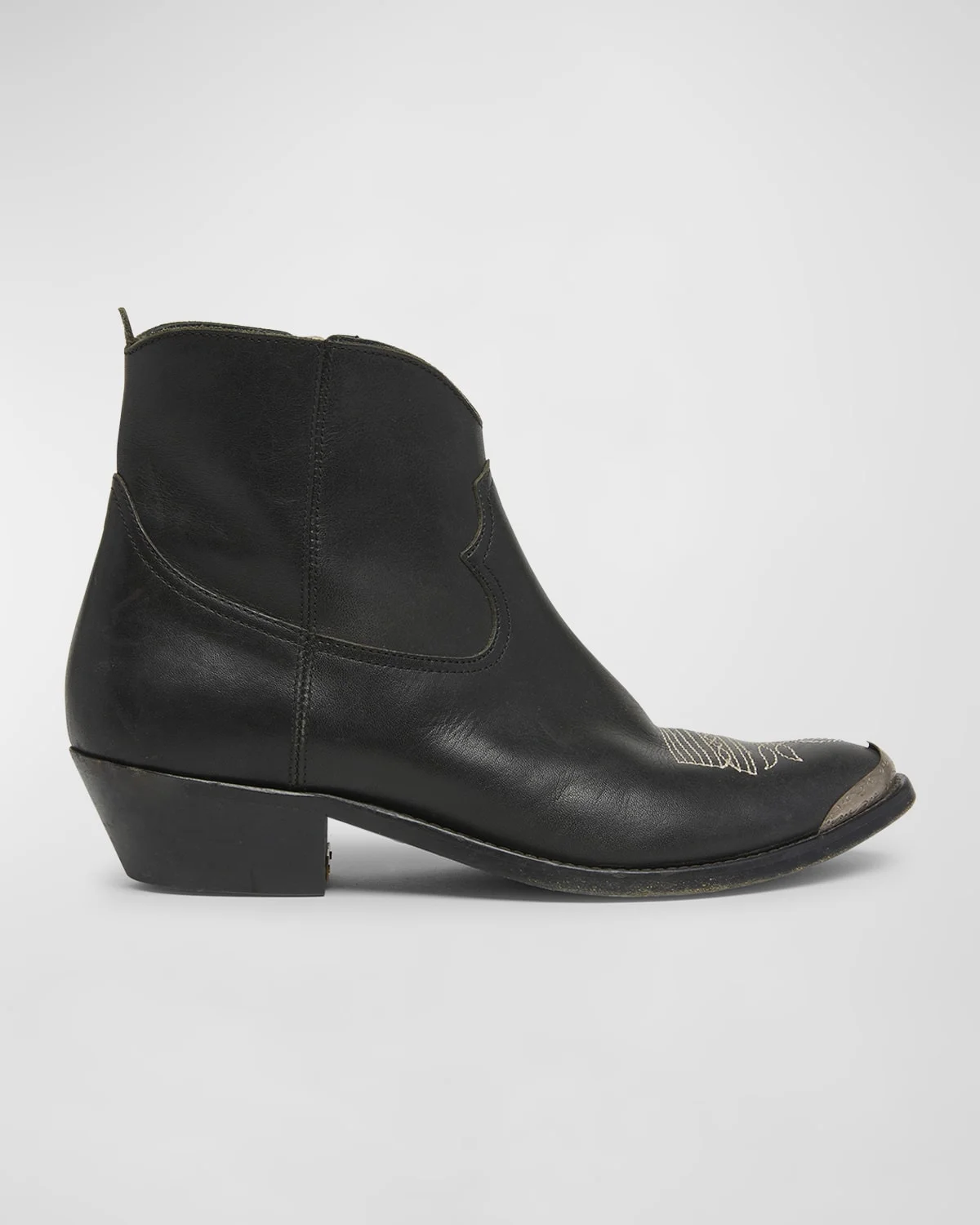 - Golden Goose leather western ankle boots with contrast stitching - 1.8" block heel - Pointed metal-cap toe - Side zip eases dress - Leather outsole - Lining: Leather - Made in Italy - Size Note: Item runs small, consider ordering a size up.