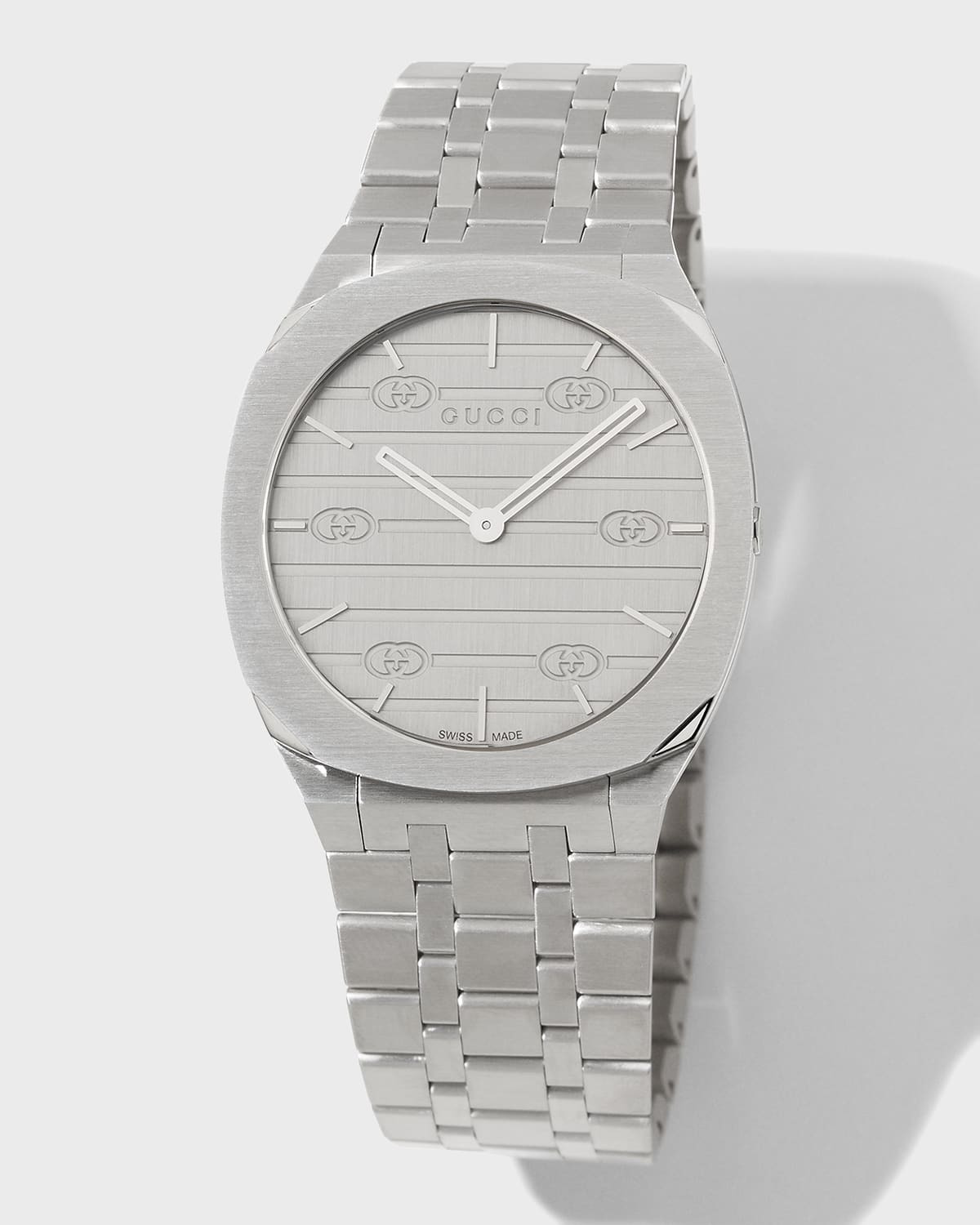 - Gucci watch in brushed stainless steel - Streamlined silhouette is inspired by the sleek forms of contemporary architecture - 34mm thin multi-layer case - Five-link bracelet with deployant clasp closure - Silvertone dial with horizontal lines and interlocking G motif - Baton indices - Swiss quartz movement - Water resistant to 3 ATM - Made in Switzerland