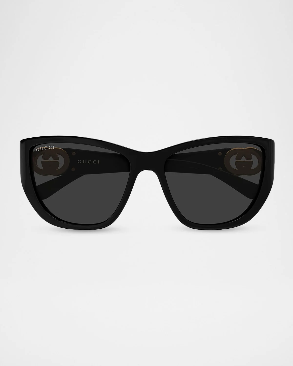 Gucci "GG2122S" oversized geometric sunglasses set on shiny acetate frames Eye/bridge/temple (in mm): 56-16-135 Solid-colored lenses Saddle nose bridge Openwork Interlocking G logo on temples Wide, tapered arms 100% UVA/UVB protection Made in Japan