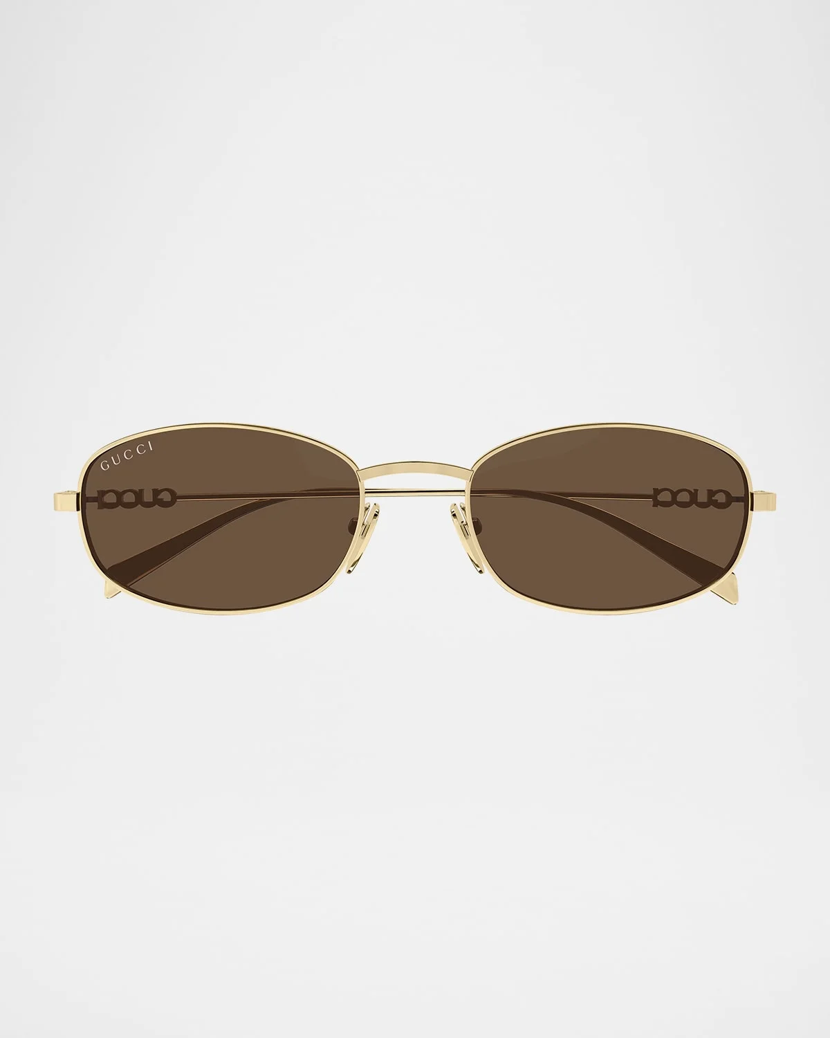 Featuring a logo insert detail at the hinges, the "Block" metal sunglasses by Gucci blend a statement silhouette with a contemporary touch. Lens/bridge/temple (in mm): 5418140 Oval frames Adjustable nose pads Thin, tapered arms Includes case and cleaning cloth 100% UVA/UVB protection Made in Italy