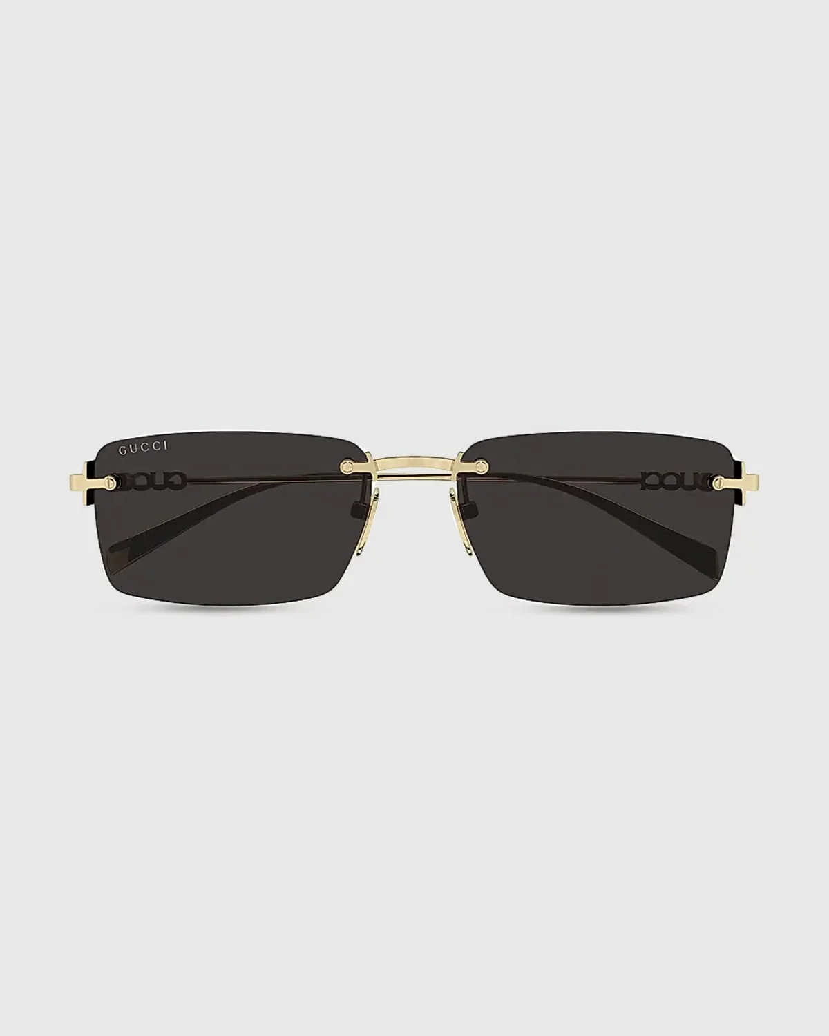 From the Gucci Block Collection, these metal sunglasses by Gucci feature cutout logo lettering at the temples. Lens/bridge/temple (in mm): 5616140 Rimless rectangular frames Solid lenses Adjustable nose pads Thin, tapered arms Includes case and cleaning cloth 100% UVA/UVB protection Made in Japan
