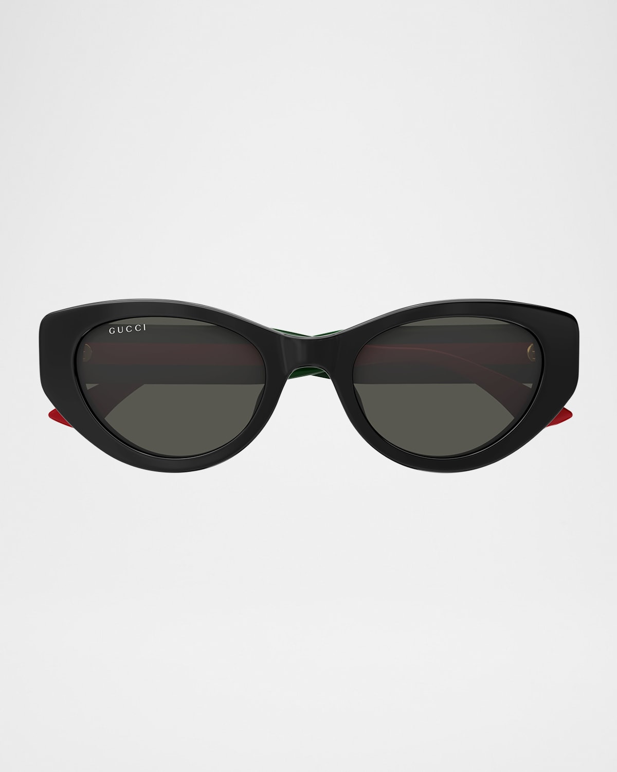 - Gucci cat-eye sunglasses in recycled acetate - Eye/bridge/temple (in mm): 52-21-145 - Solid lenses - Saddle nose bridge - Thin, tapered arms - Classic gold-tone logo at temples - Acetate - 100% UVA/UVB protection - Made in Japan - Proposition 65 warning for California residents