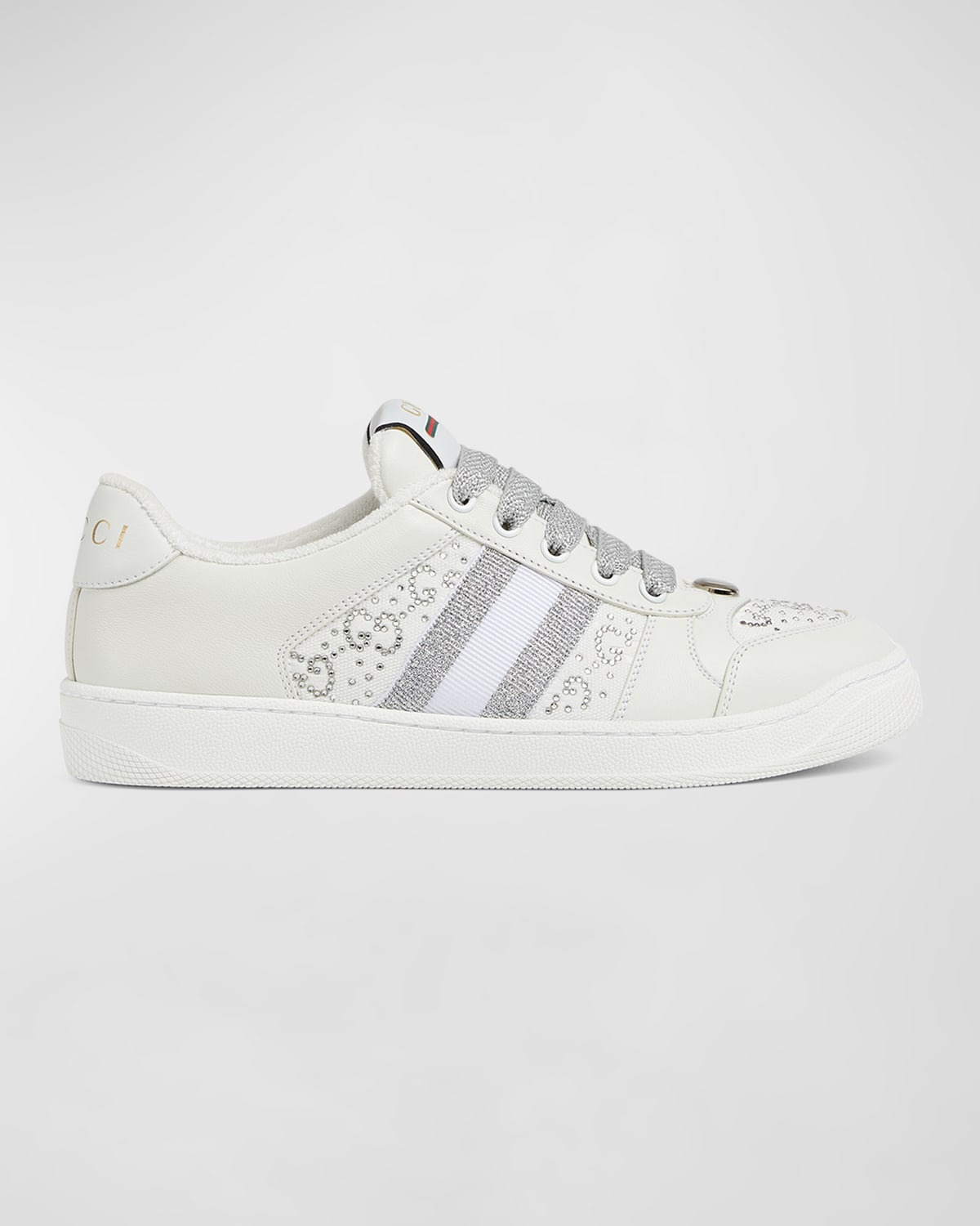 - Gucci GG crystal studded cotton and leather low-top sneakers influenced by classic trainers from the 1970s - Signature side web strap detail - GG oval enameled detail - Flat heel - Round toe - Lace-up vamp - Additional pair of laces included - Rubber outsole - Made in Italy