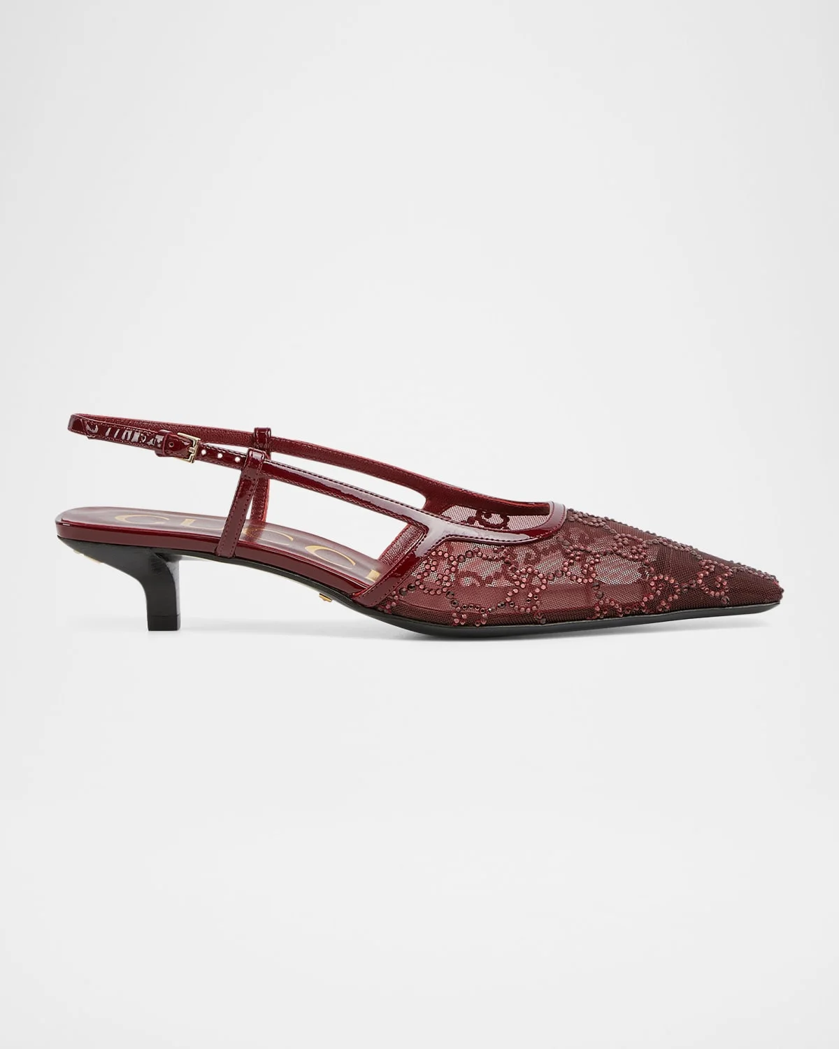 - Gucci pumps crystal-embellished GG mesh with patern leather trim - 1.38 in / 35 mm kitten heel - Pointed toe - Adjustable slingback strap - Leather outsole - Spot clean, professional cleaning recommended - Made in Italy - Size Note: Runs true to size.