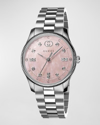 - G-Timeless watch from Gucci - Case dimensions: approx. 40mm - Stainless steel and golden plating ??? - Silvertone dial with diamond indices - Pink mother-of-pearl dial ??? - Interlocking G and logo text at 12 o'clock - Features signature motifs of the house - Three-link bracelet strap with folding closure - Sapphire glass window; anti-reflecting coating - Diamond total carat weight: 0.122 - Water resistant to 5 ATM - Three-hand movement - Made in Italy
