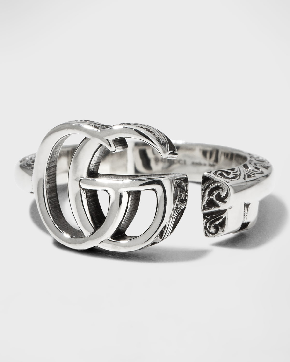 Gucci ring in sterling silver with aged, arabesqueengraved edges. Double G logo. Split design. Motif size, approx. 0.4" x 0.5". Made in Italy.