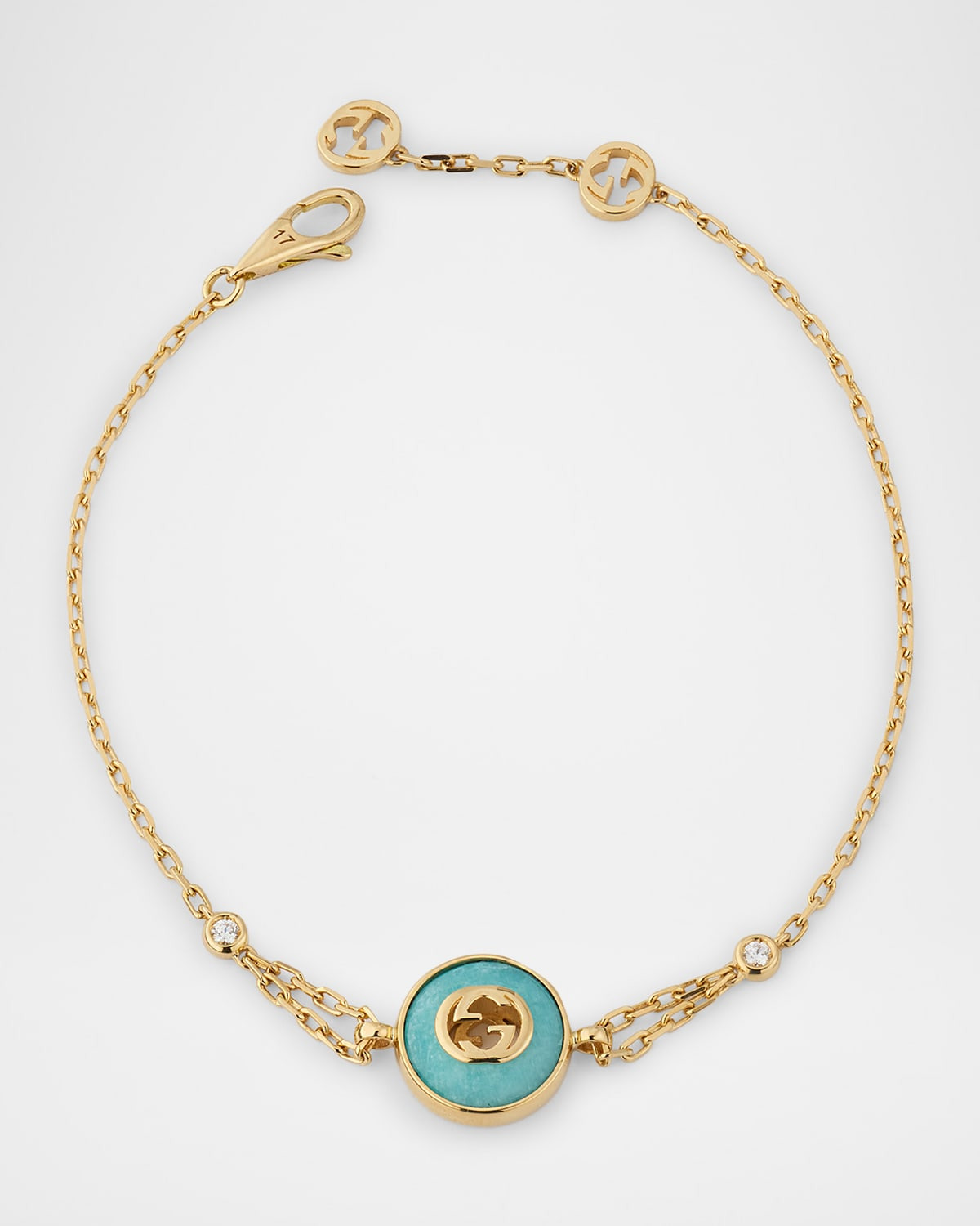 - An amazonite inlay surrounds the iconic double-G logo for this Gucci Interlocking bracelet. The soft chain is finished with two white diamond bezels. - Polished 18-karat yellow gold - 0.057 total diamond carat weight - Adjustable length - Lobster clasp - Made in Italy