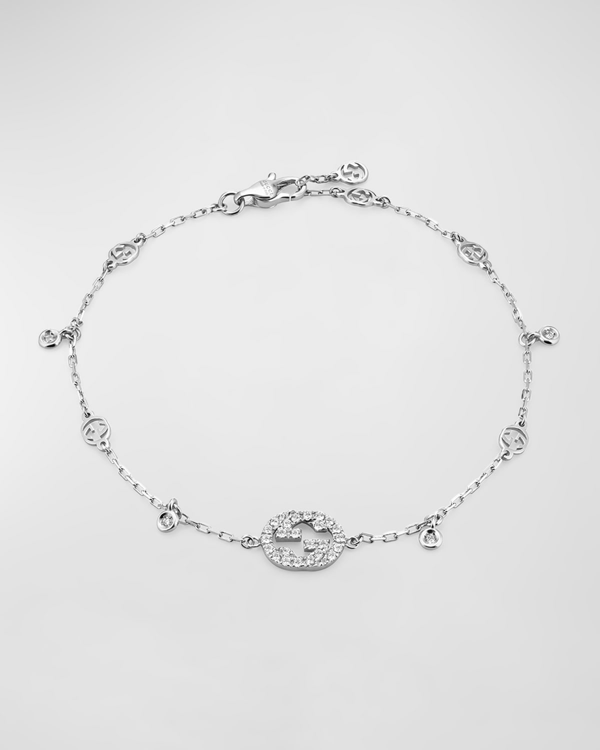 Gucci bracelet with interlocking G stations and diamond bezel charms 18karat white gold 0.2 total diamond carat weight Lobster clasp Made in Italy