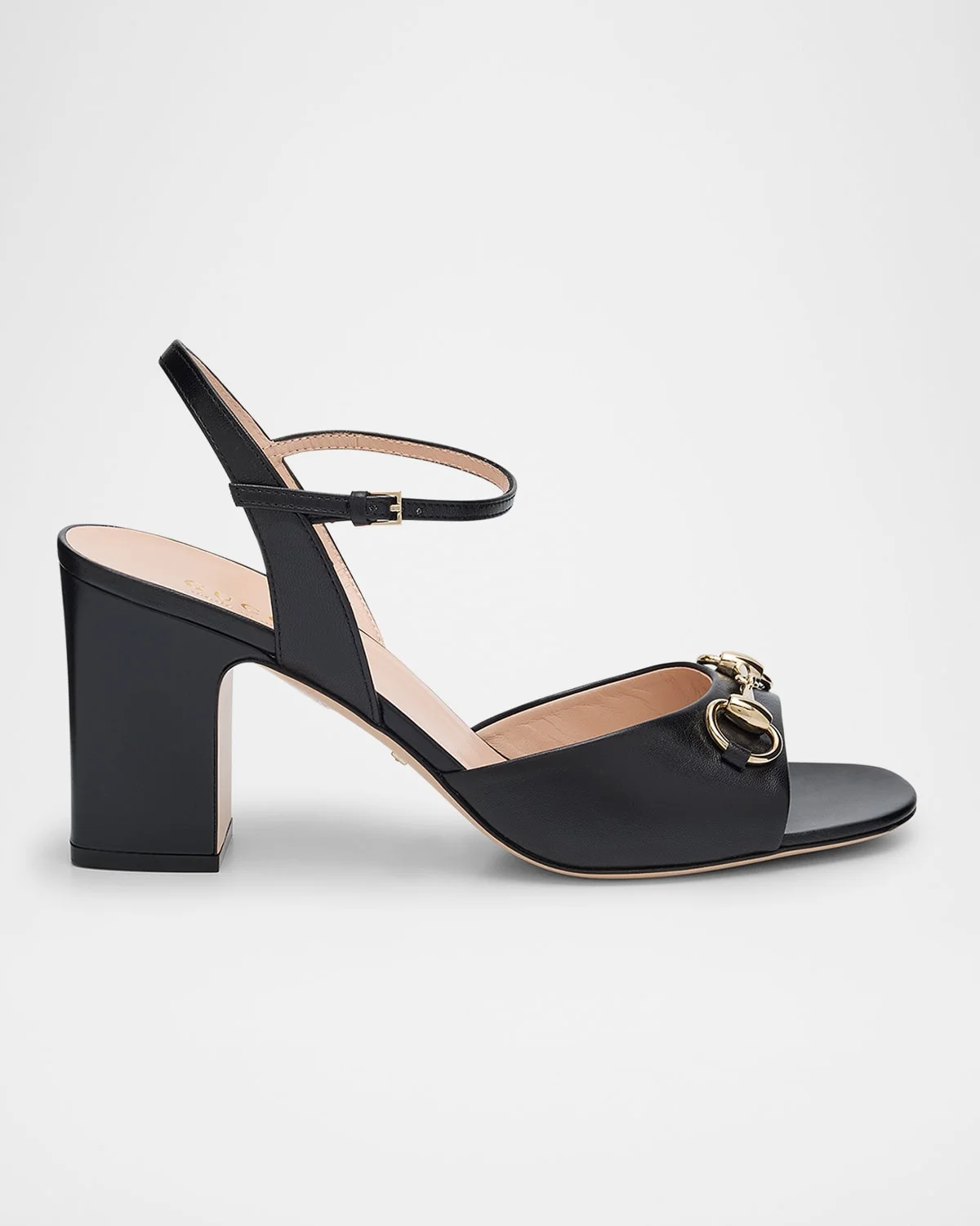 - Gucci "Lady" leather sandals with horsebit accent - 3.00 in / 75 mm block heel - Round, open toe - Single band vamp - Adjustable buckle ankle strap - Light gold-toned hardware - Leather outsole - Lining: Leather - Professional cleaning recommended, spot clean - Made in Italy