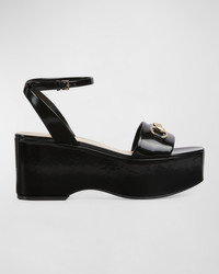 - Gucci "Lady" patent leather platform sandals - 3.00 in / 75 mm wedge heel - Open toe - Wide band with golden bit strap - Adjustable ankle strap - Leather outsole - Made in Italy