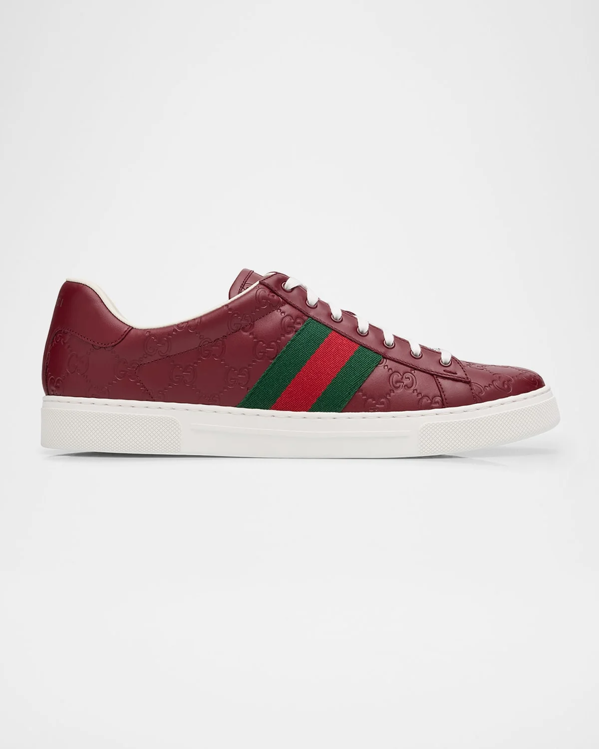 - Gucci "Ace" low-top sneakers in rosso ancora GG embossed leather - Since its debut, the ace sneaker has become a mainstay of the house's narrative. A new version of the characteristic low-top silhouette is presented in the latest collection, featuring unique details. - Green and red web on the side - 1.2"H flat heel - Round toe - Lace-up vamp; Ace metal tag - Padded collar - Backstay logo - Rubber outsole - Additional pair of laces included - Fits true to size - Made in Italy