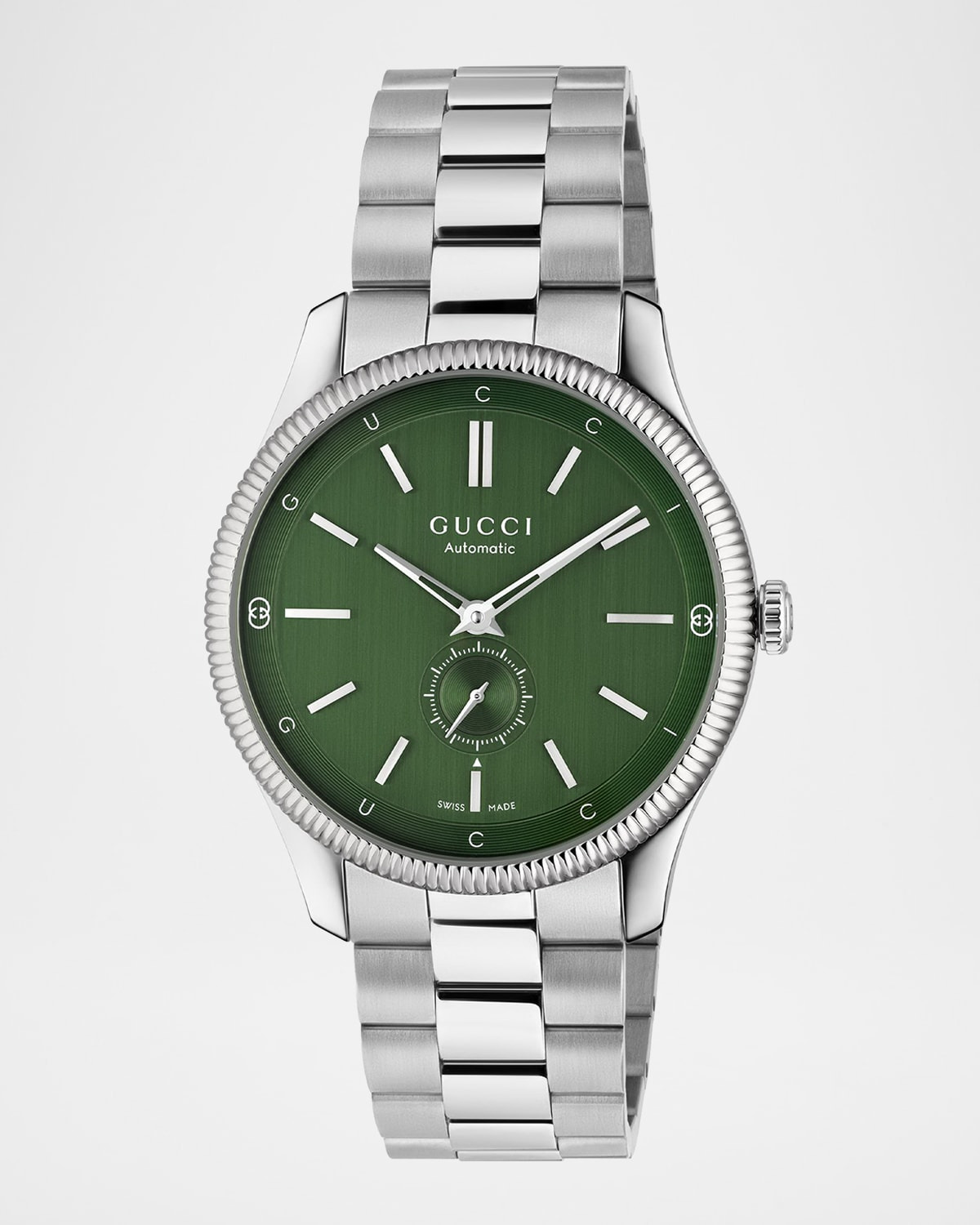 - Gucci watch from the G-Timeless line, highlighting the signature motifs of the House - 40mm; round stainless steel case - Sapphire glass with anti-reflective coating - Green dial - Logo lettering and small seconds display - Logo at 12 o'clock - Subdial at 6 o'clock - Three-link stainless steel bracelet - Deployant buckle - Automatic movement - Water resistant at 5 ATM - Made in Switzerland