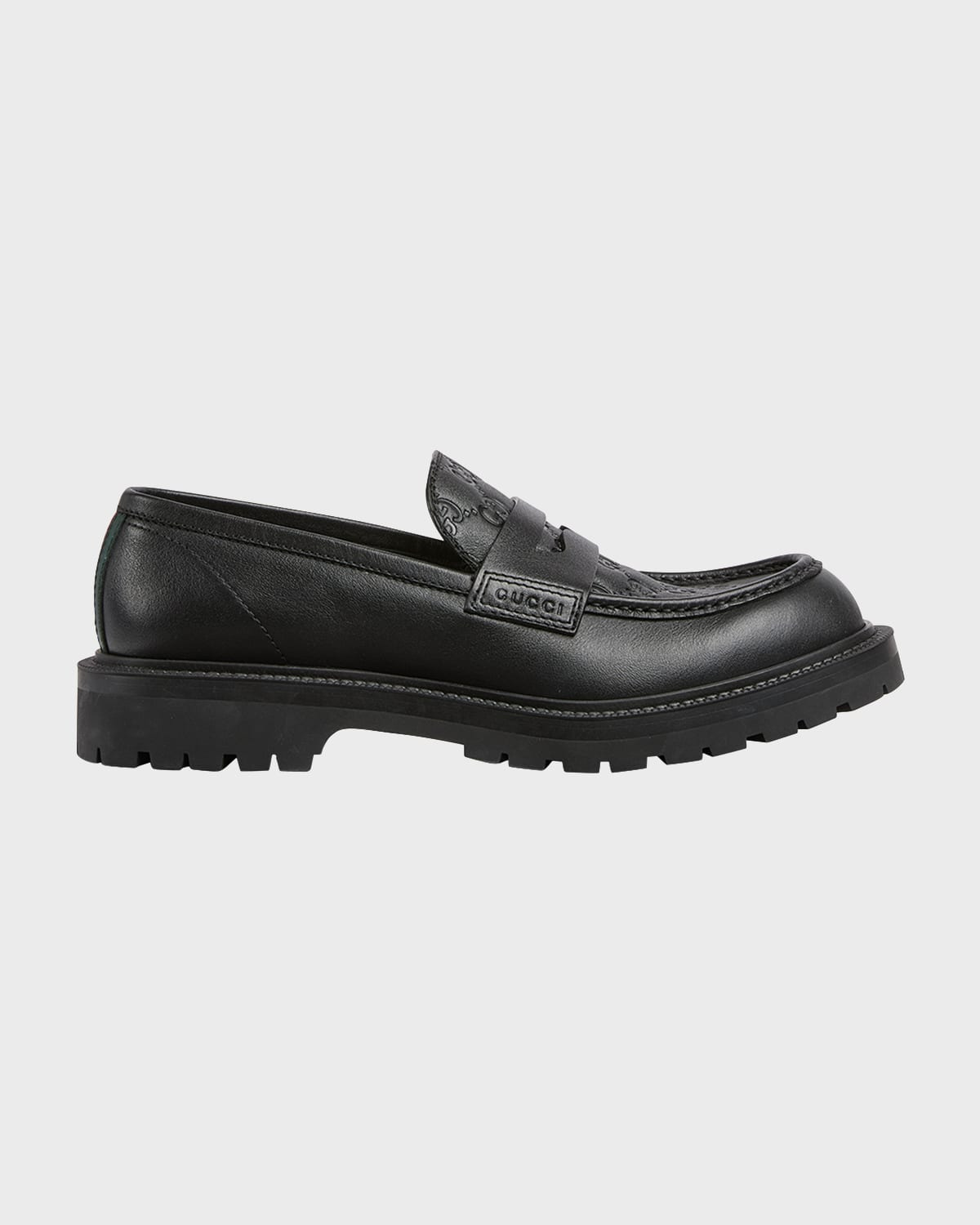 - Gucci "Miart" calfskin leather loafers stamped with GG details - Chunky heel - Round moc toe - Notched vamp with keeper strap - Slip-on style - Lug soles - Made in Italy