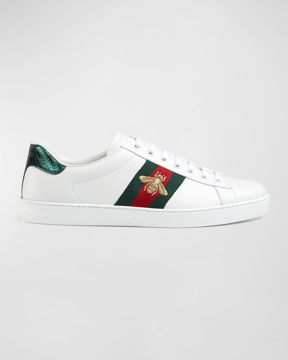 - Gucci "New Ace" leather low-top sneaker with embroidered bee. - Logo-stamped red snakeskin detail on the back of one shoe. - Logo-stamped blue snakeskin detail on the back of the other shoe. - Round toe. - Signature blue/red/blue Web stripe. - Lace-up front. - 0.25" (5mm) rubber sole. - Made in Italy.