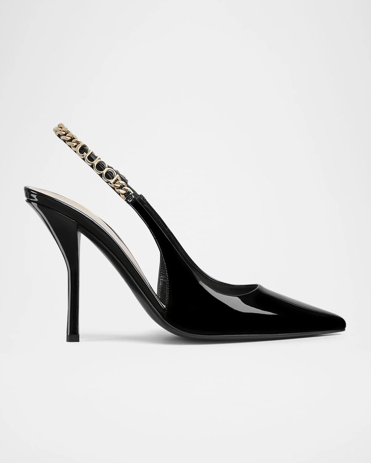 - Gucci "Signoria" pump, named after the central piazza of Florence, recalls the classic elegance of the house’s founding city. With its shiny patent leather, pointed toe and eye-catching Gucci chain, this slingback style elevates the everyday wardrobe for the coming season. - 4.25 in / 105 mm stiletto heel - Pointed toe - Logo chain slingback - Leather sole - Made in Italy - Size Note: Runs true to size.