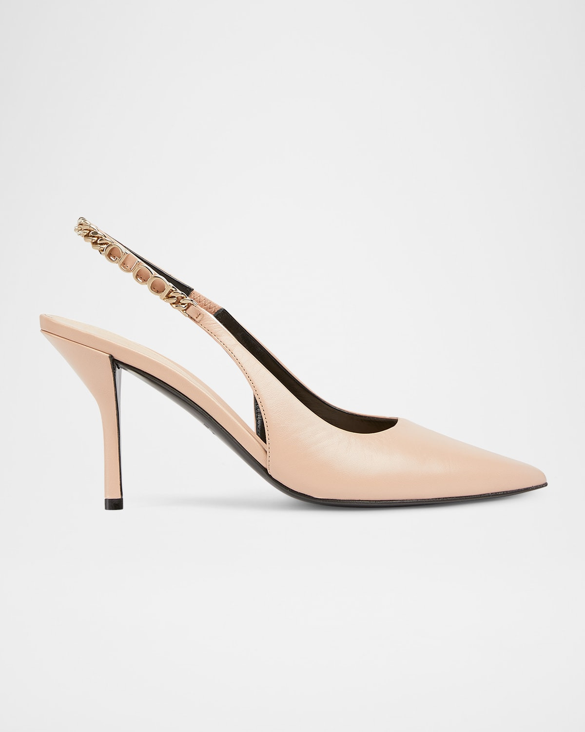 - The Gucci Signoria pump, named after the central piazza of Florence, recalls the classic elegance of the house’s founding city. With fine leather, pointed-toe, and eye-catching Gucci chain, this slingback style elevates the everyday wardrobe for the coming season. - Gucci "Signoria" pumps in goat leather - 3.25 in / 85 mm stiletto heel - Pointed toe - Logo chain slingback - Leather outsole - Spot clean, professional cleaning recommended - Made in Italy - Size Note: Runs true to size.