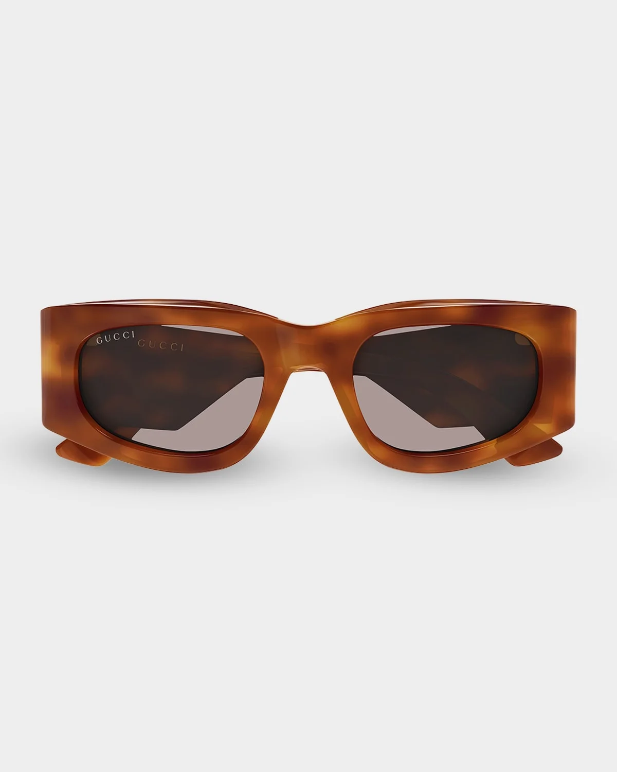 Crafted from tortoiseshell-effect acetate, the Gucci "GG1664S" sunglasses feature a rectangular silhouette characterized by sharp, elegant lines. Eye/bridge/temple (in mm): 51-21-140 Solid-colored lenses Saddle nose bridge Lasered Guccissima monogram on temples Wide, tapered arms Acetate 100% UVA/UVB protection Made in Italy