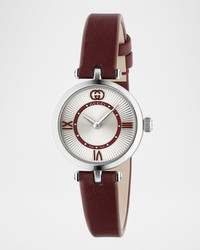 - For the Cruise 2025 collection, the polished and minimalist look extends to jewelry and watches. Taking inspiration from archival codes, the Model 2000 design combines the Italian style with Swiss craftsmanship. Presented with a red leather strap, this watch features a silver guilloche dial, enriched with historic codes of the House. - Model 2000 watch by Gucci - Approx. 24mm round stainless steel case - Wrist size from 5.5" to 7" - Silver guilloche dial, green-red-greed resin stripes on the case side - Luminescent hands and Roman numeral time markers - Interlocking G at 12 o'clock - Sapphire glass with anti-reflective coating - Red leather strap with stainless steel thorn buckle - Water resistance: 5 ATM - Made in Switzerland
