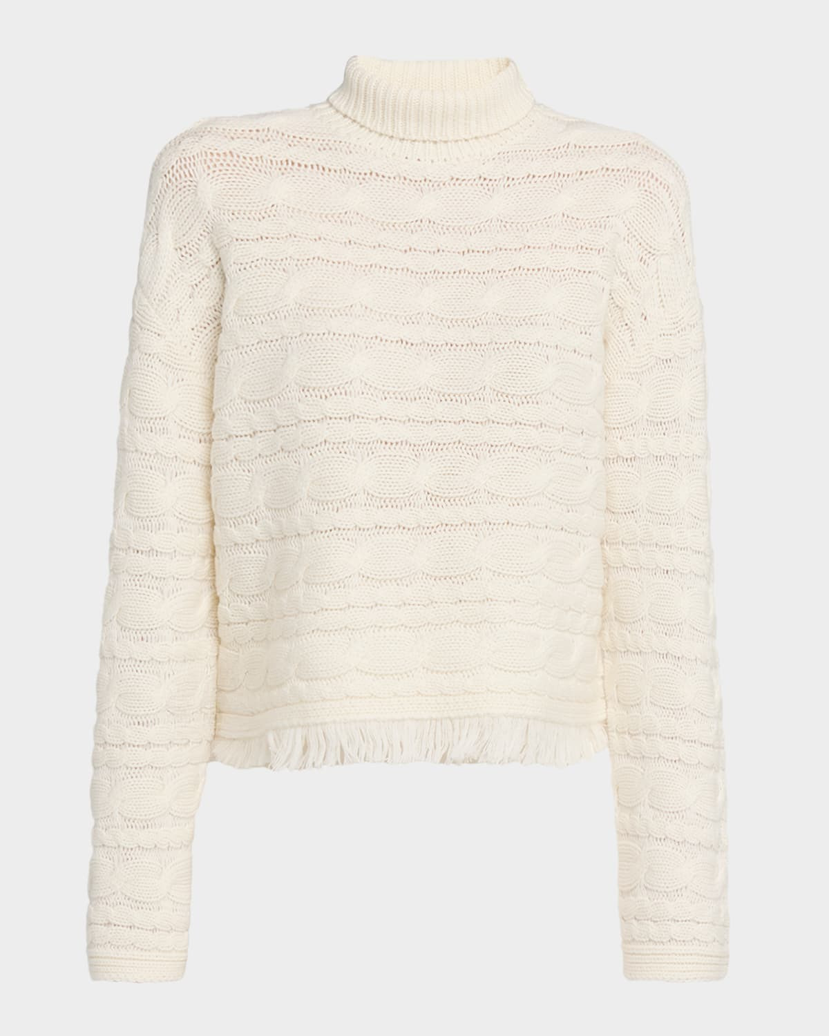 Punctuated with tonal fringe trim for added texture, this sweater by Guest in Residence is knit from a heavyweight blend of wool and cashmere with a horizontal cableknit design 3GG Ribbed turtleneck Dropped shoulders Long sleeves Relaxed fit Pullover style Wool/cashmere Imported