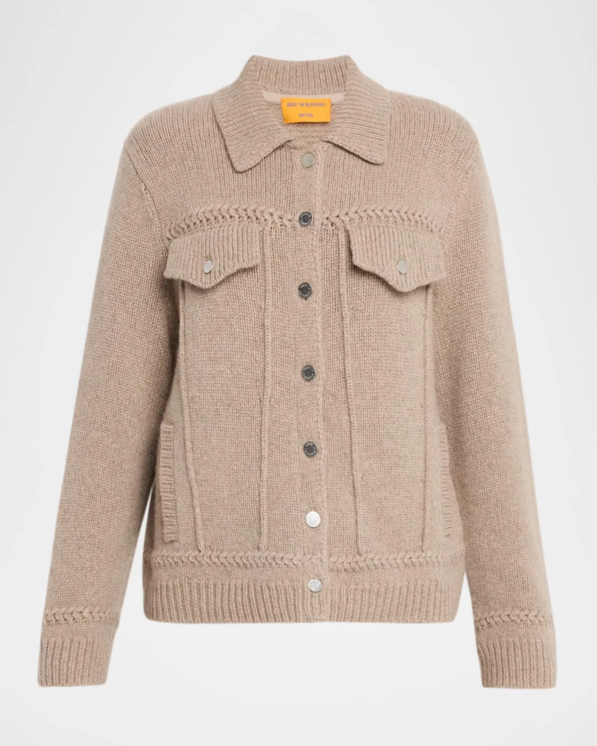 Blending the structured of outerwear with the softness of knitwear, the "Jean" sweater by Guest in Residence is knit from a heavyweight blend of cashmere and wool and decorated with braided trim in a classic trucker jacketinspired silhouette 3GG Ribbed spread collar; button front Long sleeves; button cuffs Two front chest pockets with button closures Two sideentry welted pockets Yoked back Relaxed fit Hip length Cashmere/merino wool Imported