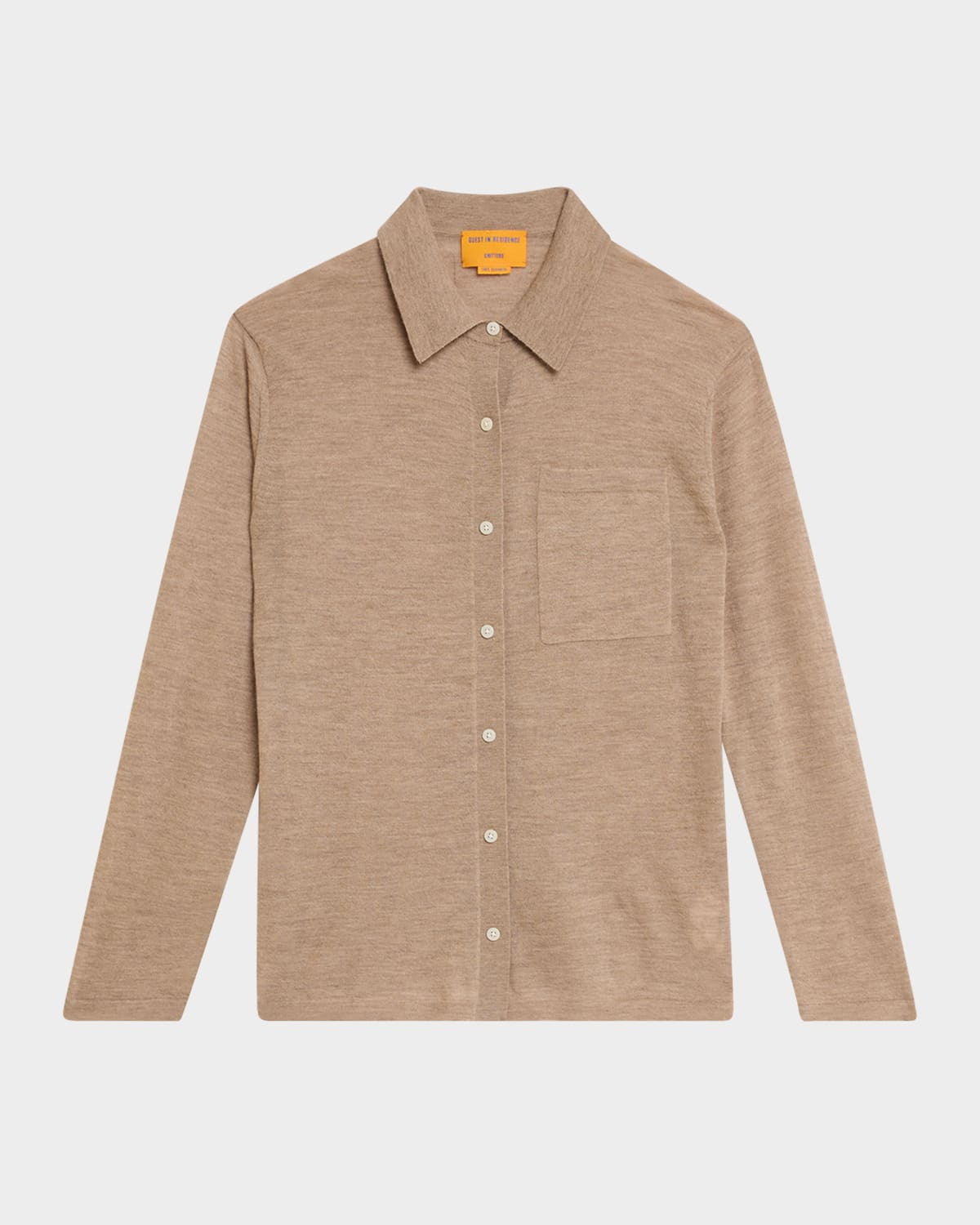 - Guest in Residence "Showtime" lightweight knit shirt with front patch pocket - Approx. 27”L from shoulder to hem - Spread collar; button placket - Long sleeves; approx. 31.5"L - Oversized fit - Hip length - Cashmere - Dry clean - Imported