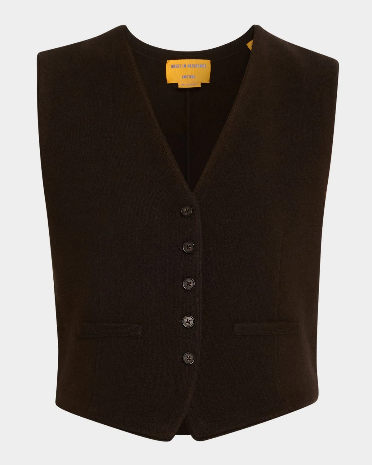 Guest in Residence vest boasts a rear cinch strap Approx. 21"L from shoulder to hem V neckline Button front Front welt pockets Cropped length Cashmere Dry clean Imported