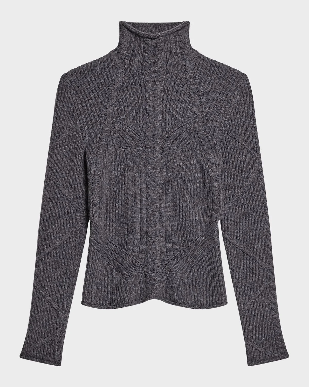 Finished with rolled trim, this sweater by Helmut Lang is knit with textural cable detailing throughout Turtleneck Long sleeves Slim fit Hip length Pullover style Polyester Dry clean Imported