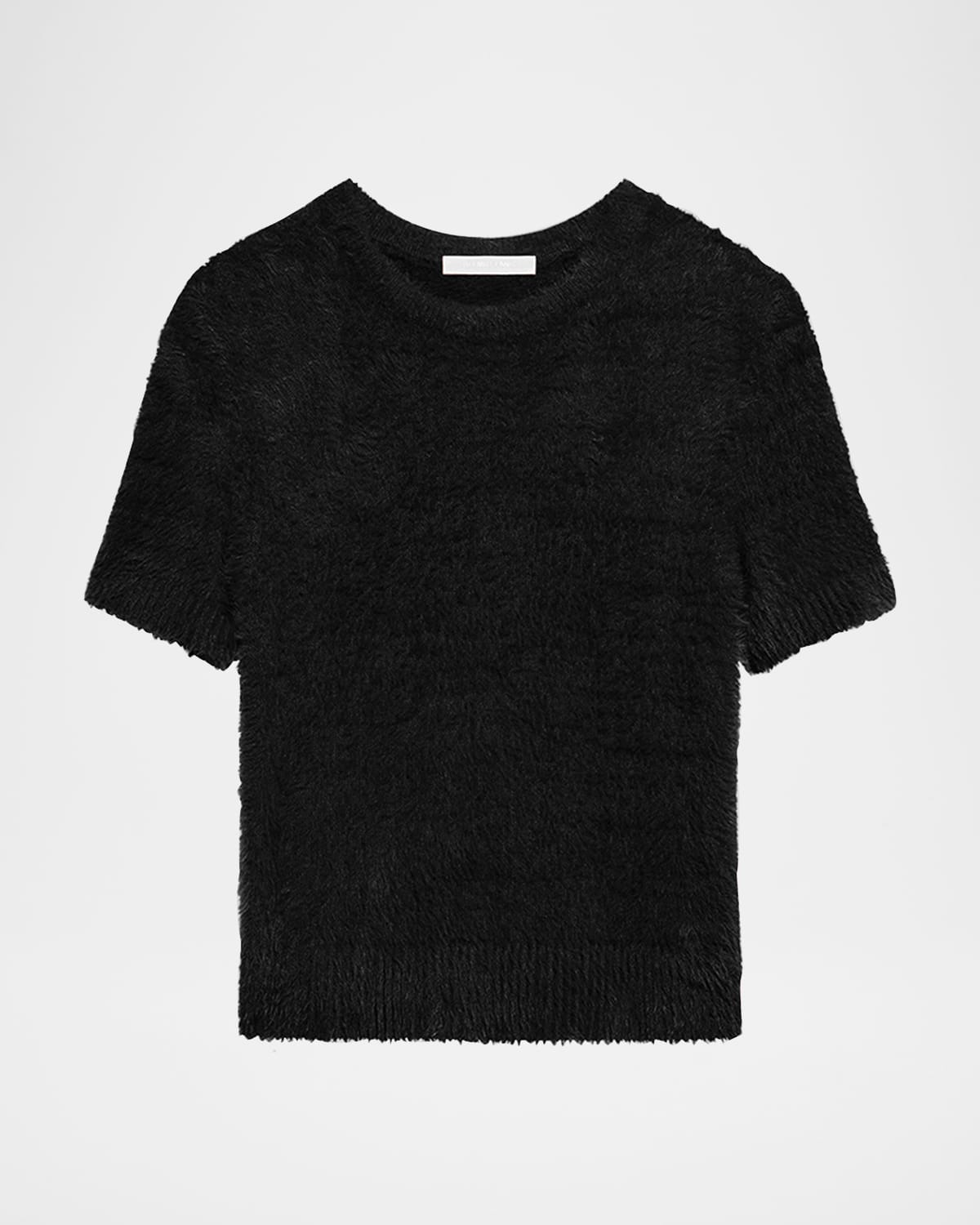 - Helmut Lang tee crafted from a feathery-soft eyelash knit - Crew neckline - Short sleeves - Slim fit - Cropped length - Pullover style - Nylon/polyamide - Dry clean - Imported