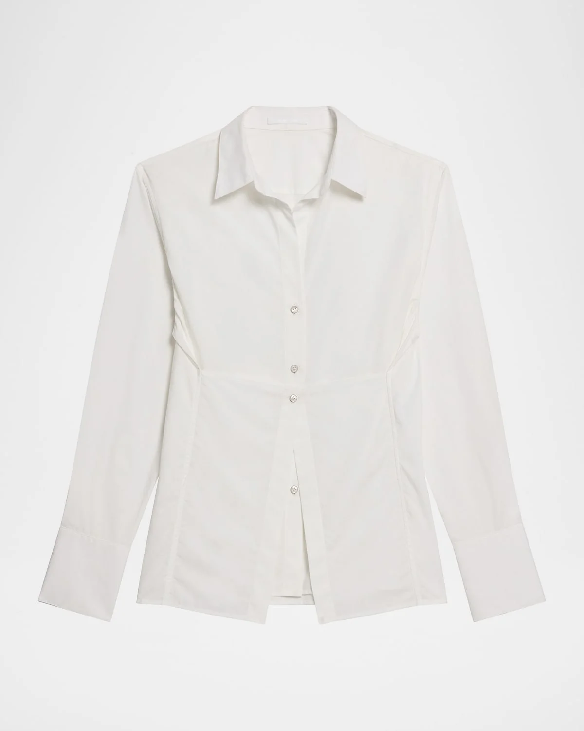 Helmut Lang crisp cotton poplin shirt adorned with a wraparound apronstyle panel Point collar Long sleeves with button cuffs; approx. 24.5"L Fitted silhouette Hem sits at the hip Buttonfront Cotton Dry clean Imported