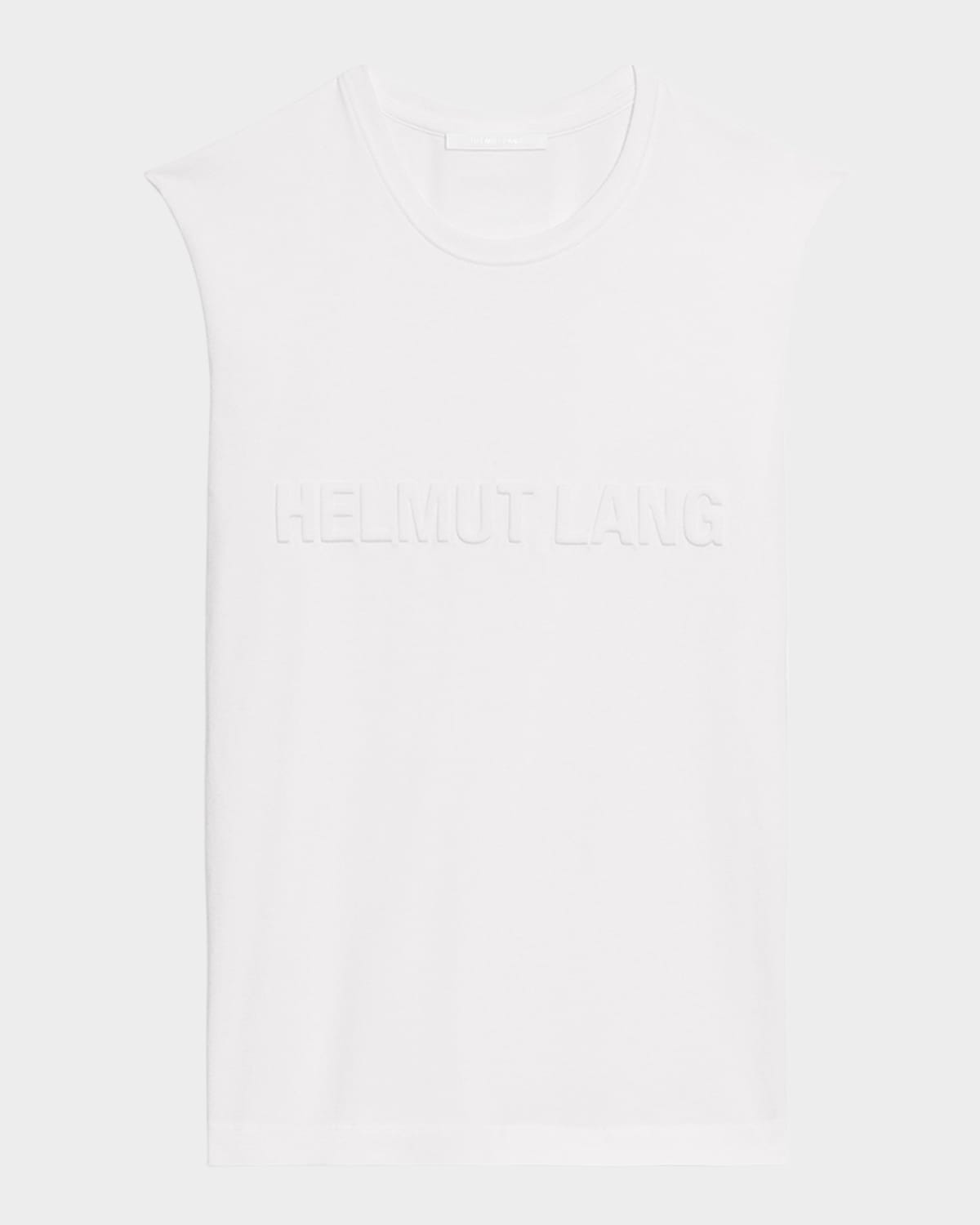 - Helmut Lang solid tank top with embossed logo - Crew neckline - Sleeveless; approx. 0.0"L - Relaxed fit - Pullover style - Cotton - Machine wash cold - Made in Portugal - Shipping - Direct from Vendor, usually ships within 7 business days.