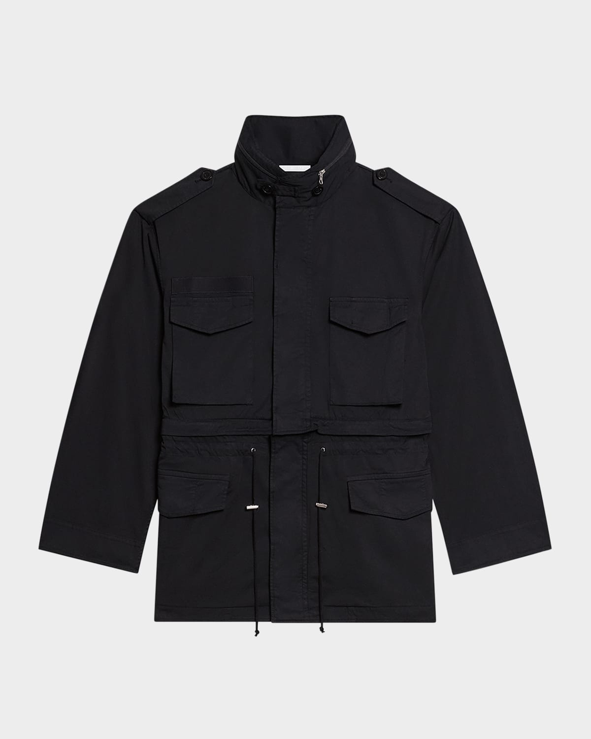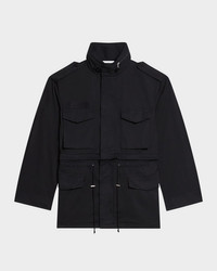 - Helmut Lang field jacket featuring four front utility pockets - Approx. 33.75"L from shoulder to hem - Tonal logo lettering along the back yoke - Stand collar with throat latch - Stowaway hood - Concealed zip front - Waist cinch - Long sleeves; approx. 36.0"L - Single-button cuffs - Buttoned eqaulettes - Relaxed fit - Cotton/elastane - Unlined - Imported