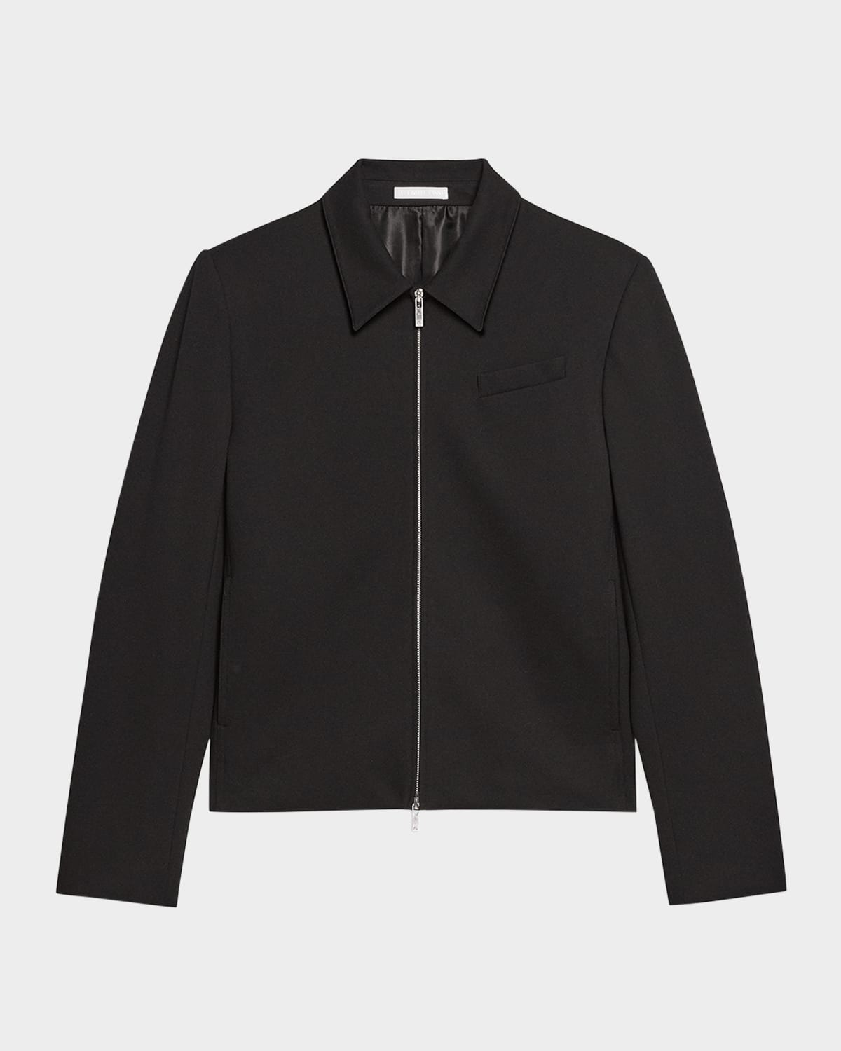 - Exposed shiny zippers on the front and cuffs create a modern, edgy feel for this Helmut Lang blazer. - Approx. 25.75"L from shoulder to hem - Point collar - Long sleeves; approx. 35.5"L - Two-way zipper - Chest welt pocket - Side slip pockets - Zip-up cuffs - Rayon/cellulose acetate/nylon/polyamide/spandex - Lining: Viscose - Dry clean - Imported