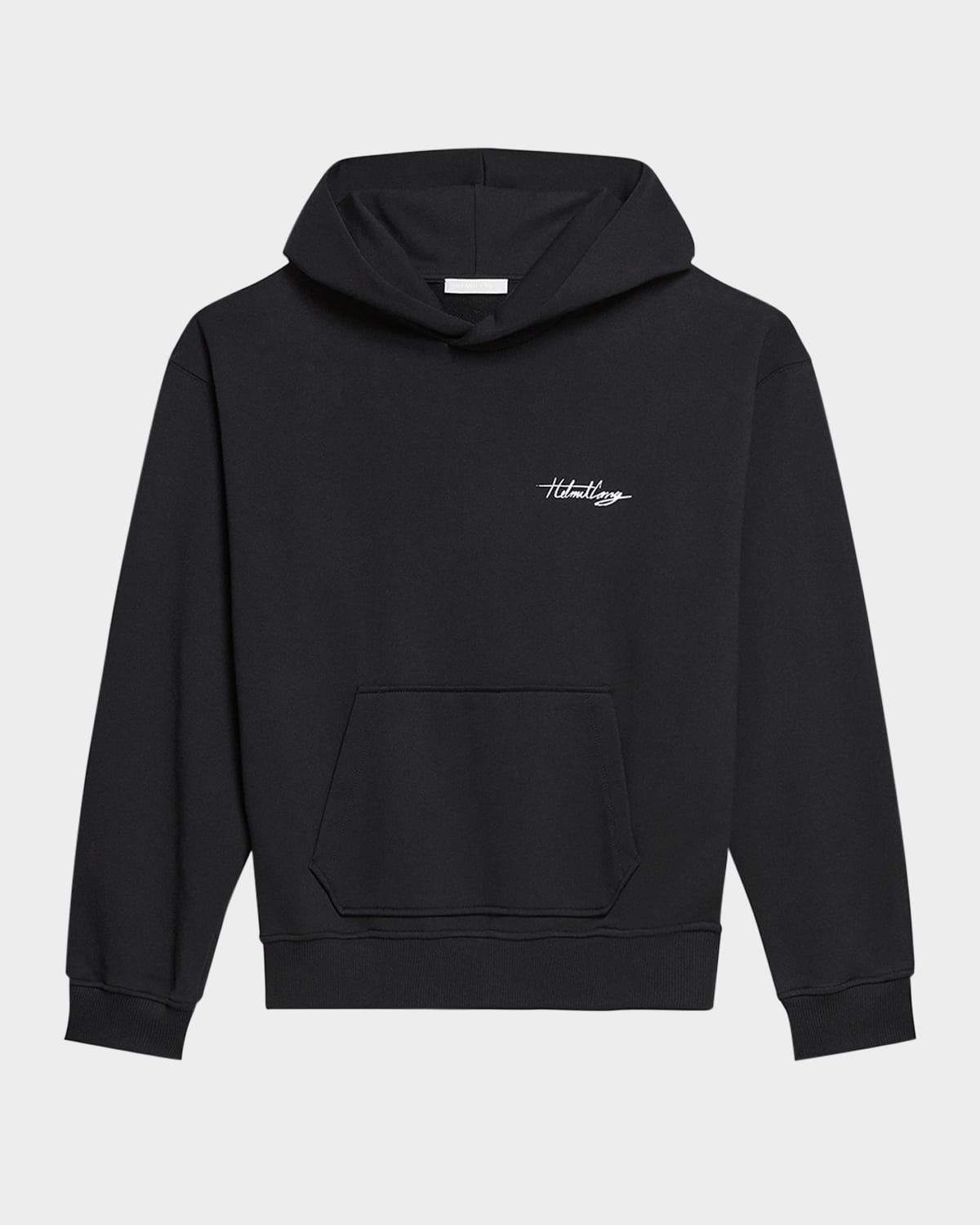 - This comfortable hoodie from Helmut Lang is detailed with logos on the front and back, then enzyme-washed for a soft feel and unique finish. - Approx. 27.5"L from shoulder to hem - Hooded neckline - Long sleeve; approx. 35.5"L - Logo script on the front - Large logo on the back - Kangaroo pocket - Banded cuffs and hem - Pullover style - Cotton - Machine wash cold - Made in Portugal