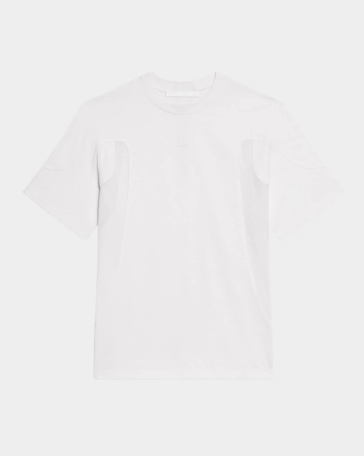 - Helmut Lang "Sport" T-shirt featuring a paneled construction with mesh detailing - Embossed logo on the front - Crew neckline - Short sleeves; approx. 19.5"L - Relaxed fit - Pullover style - Cotton - Unlined - Machine wash cold - Made in Portugal
