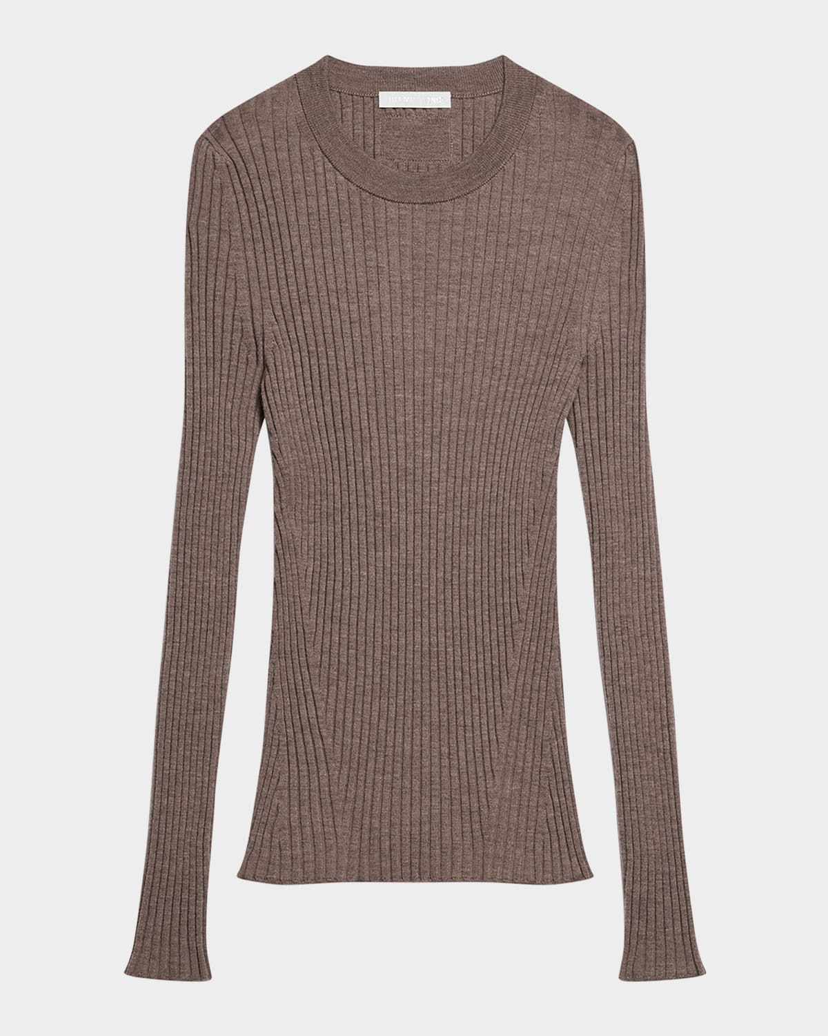 - Helmut Lang ribbed wool top enhanced with an open back - Crew neckline - Long sleeves; approx. 32.3"L - Easy fit - Hem sits at the hip - Pullover style - Wool - Unlined - Dry clean - Imported