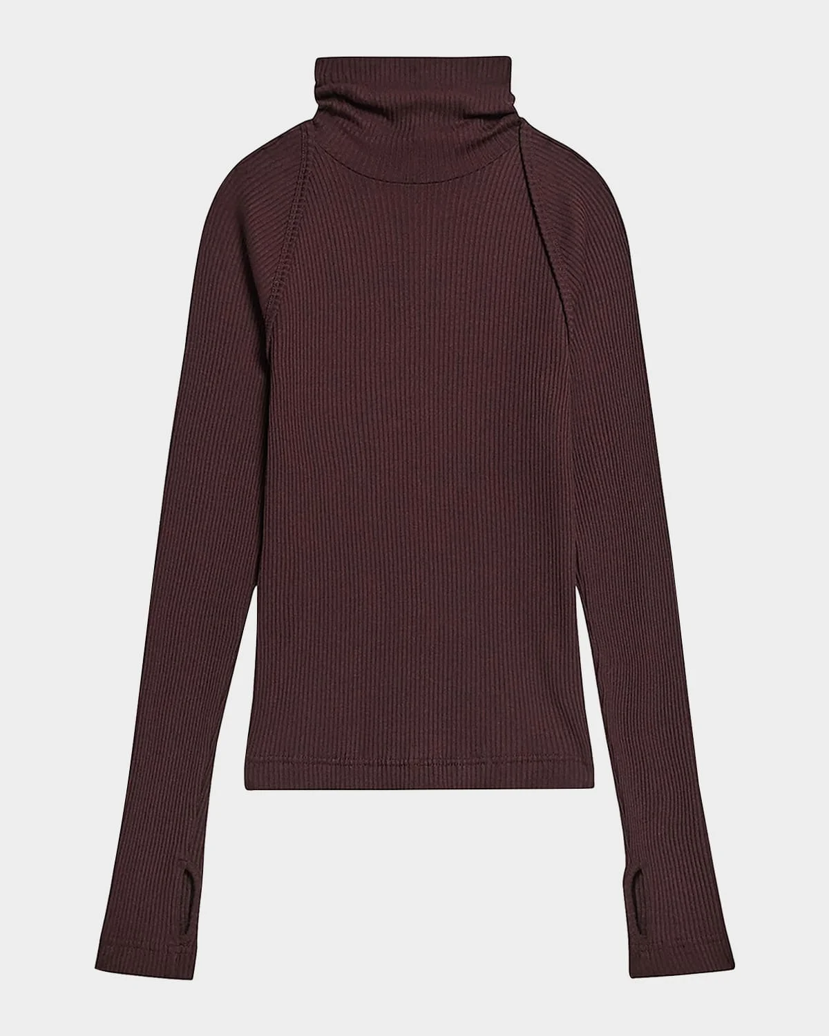 Featuring a layered silhouette, this Helmut Lang turtleneck is crafted from soft ribbed knit with a shrugeffect silhouette. Turtleneck Long sleeves with thumbholes; approx. 33.3"L Slim fit Hem sits at the hip Pullover style Cotton/spandex Machine wash cold Imported