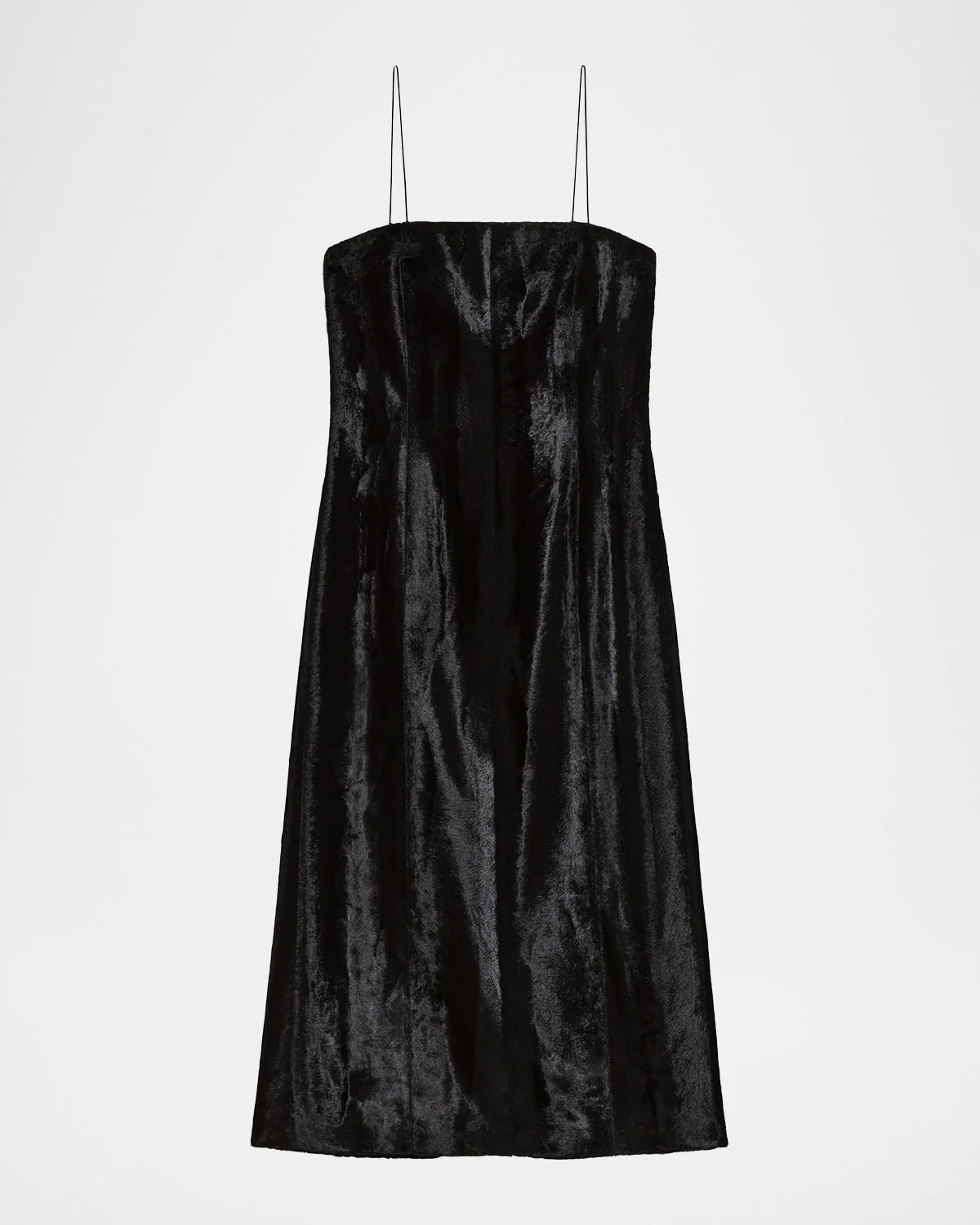 Crafted in faux pony hair, this Helmut Lang midi dress features removable spaghetti straps and a refined, structured silhouette. Strapless neckline Sleeveless Center back slit Invisible side zip Rayon/cellulose acetate/cotton Dry clean Imported