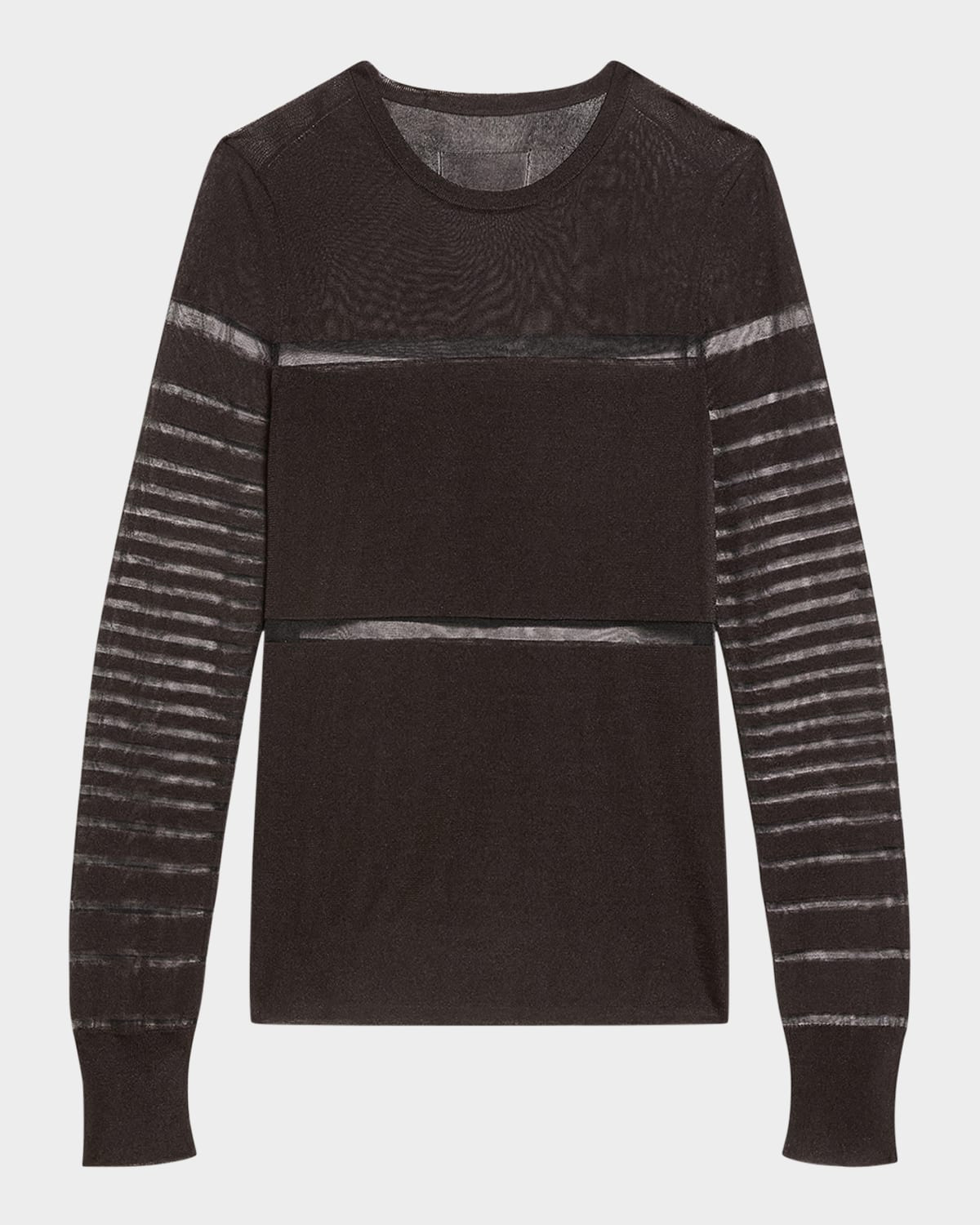 - Helmut Lang sheer paneled top - Crew neckline - Long sleeves; approx. 32"L - Relaxed fit - Hem falls to the hip - Pullover style - Viscose/nylon/polyamide - Unlined - Dry clean - Imported