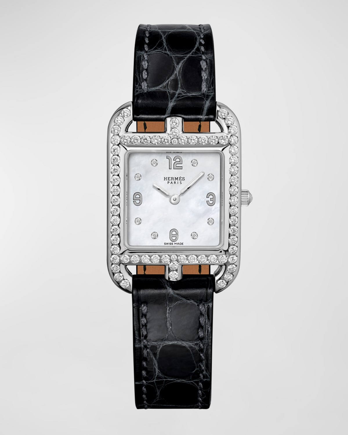 • Case: stainless steel with diamond pavé, 31 x 31 mm • Dial: mother of pearl (naturally colored; cultured) set with 8 diamond markers • Movement: quartz • Functions: hours, minutes • Strap: polished black alligator leather; pin buckle closure • Total carat weight: 0.951 • Made in Switzerland Online Inquiries: NMS21_PEACH Store Inquiries: #4408641 Time, an Hermès object. Hermès creates objects. Objects shaped by the hands of artisans to make them true companions for those who wear them. Practical, functional and stemming from uncompromising expertise, they radiate the lightness of the unexpected. They make everyday life their playground, and each instant a uniquely special moment. For Hermès, time is also an object. Its inherent tension is translated by the house into a singular characteristic. Rather than measuring, ordering, and seeking to control it, Hermès dares to explore another time, designed to arouse emotions, open up interludes and create spaces for spontaneity and recreation.