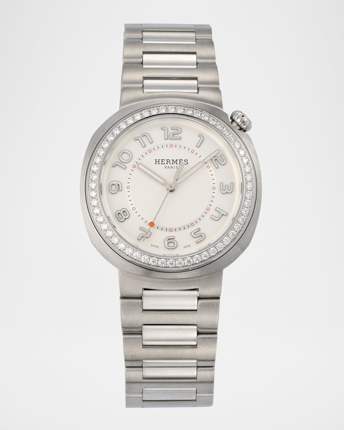 - Large model, 36mm round case - Diamond-set circular satin-brushed steel case and polished fuseaux - 56 white diamonds (~ 0.834 total carat weight) - Anti-glare sapphire crystal and case-back - Opaline silvered dial - Rhodium-plated applied Arabic numerals coated with Super-LumiNova® - Hands coated with Super-LumiNova® - Hermes Manufacture movement H1912 - Mechanical self-winding movement, approximately 50-hour power reserve - Hour, minute, second functions - Water-resistant to 10 bar. - Single tour bracelet in steel, steel folding clasp - Made in Switzerland