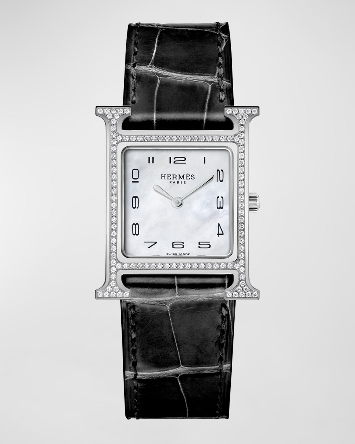 Medium model, 30 mm Lug to lug height: 30 mm Case width: 26 mm Diamondset steel case, "feather" setting, 112 diamonds (0.45 ct) Antiglare sapphire crystal White motherofpearl dial Quartz movement, Swiss made Hour, minute functions Waterresistant to 3 bar. Avoid all contact with water while wearing your Hermes leather watch Long single tour strap in smooth black alligator, steel pin buckle