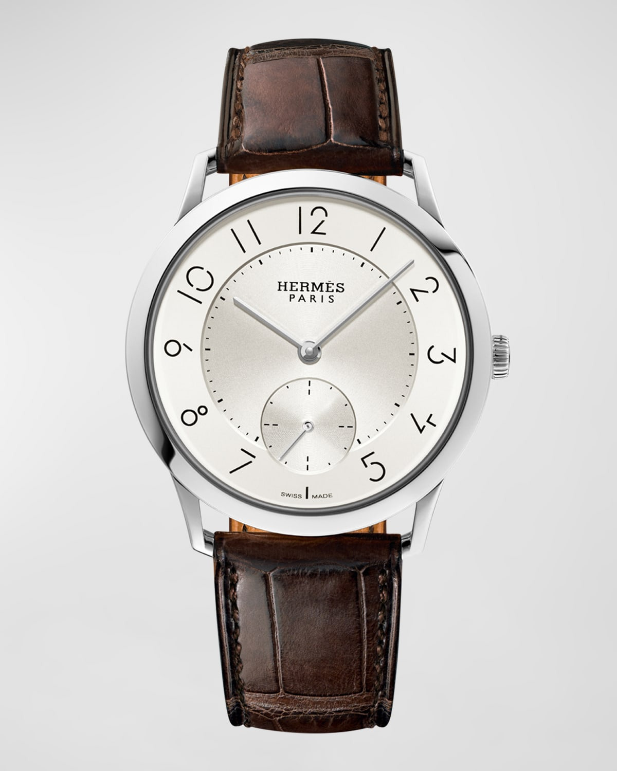 - Case: stainless steel, 39.5mm - Antiglare sapphire crystal and case-back - Water-resistant to 3 bar; avoid all contact with water while wearing your hermes leather watch. - Dial: opaline silvered dial, sunburst chapter ring, snailed small-seconds counter and dial center - Movement: Hermes Manufacture movement H1950 - Functions: Hours, minutes and small seconds at 6 o'clock - Bracelet: long single tour strap in matte Havana alligator, steel pin buckle - Made in Switzerland