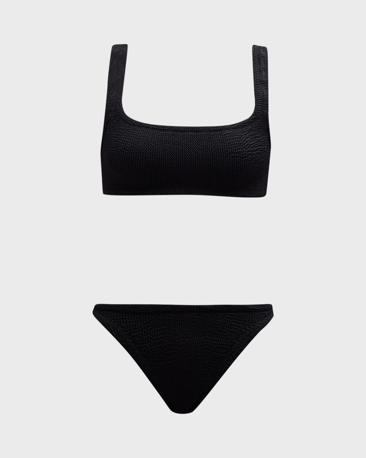 Hunza G "Xandra" twopiece bikini set in a crinkled finish Square neckline Fixed shoulder straps Pullover style Lowrise hipster style Moderate seat coverage One size fits most Nylon/Lycra xfit® spandex Made in United Kingdom