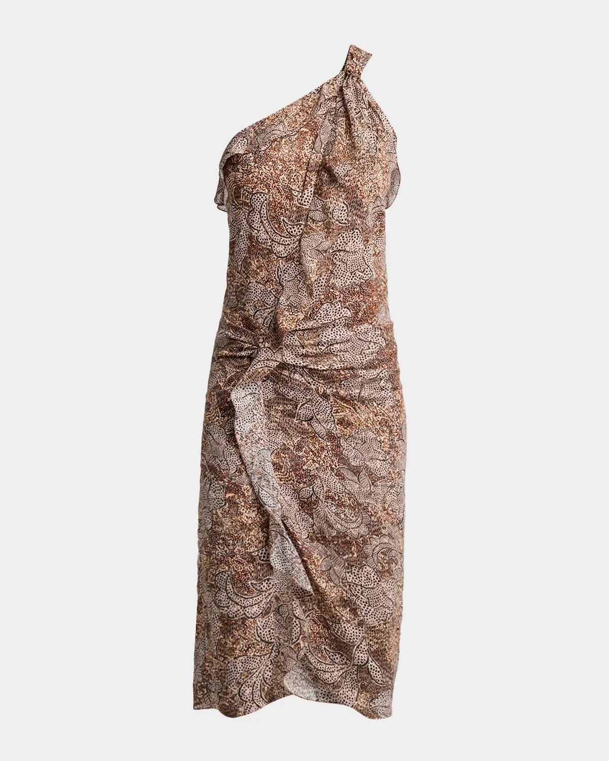 Crafted from fluid cotton, the "Charlota" dress from Isabel Marant features a spotted floral print and & nbsp;ruffles cascading along a side slit hem One-shoulder neckline Sleeveless Sheath silhouette Knee length Side slit hem Invisible side zip Cotton Hand wash or dry clean Imported SIZE & FITModel measurements: 5 & apos;10" tallModel is wearing a US size 4/Small