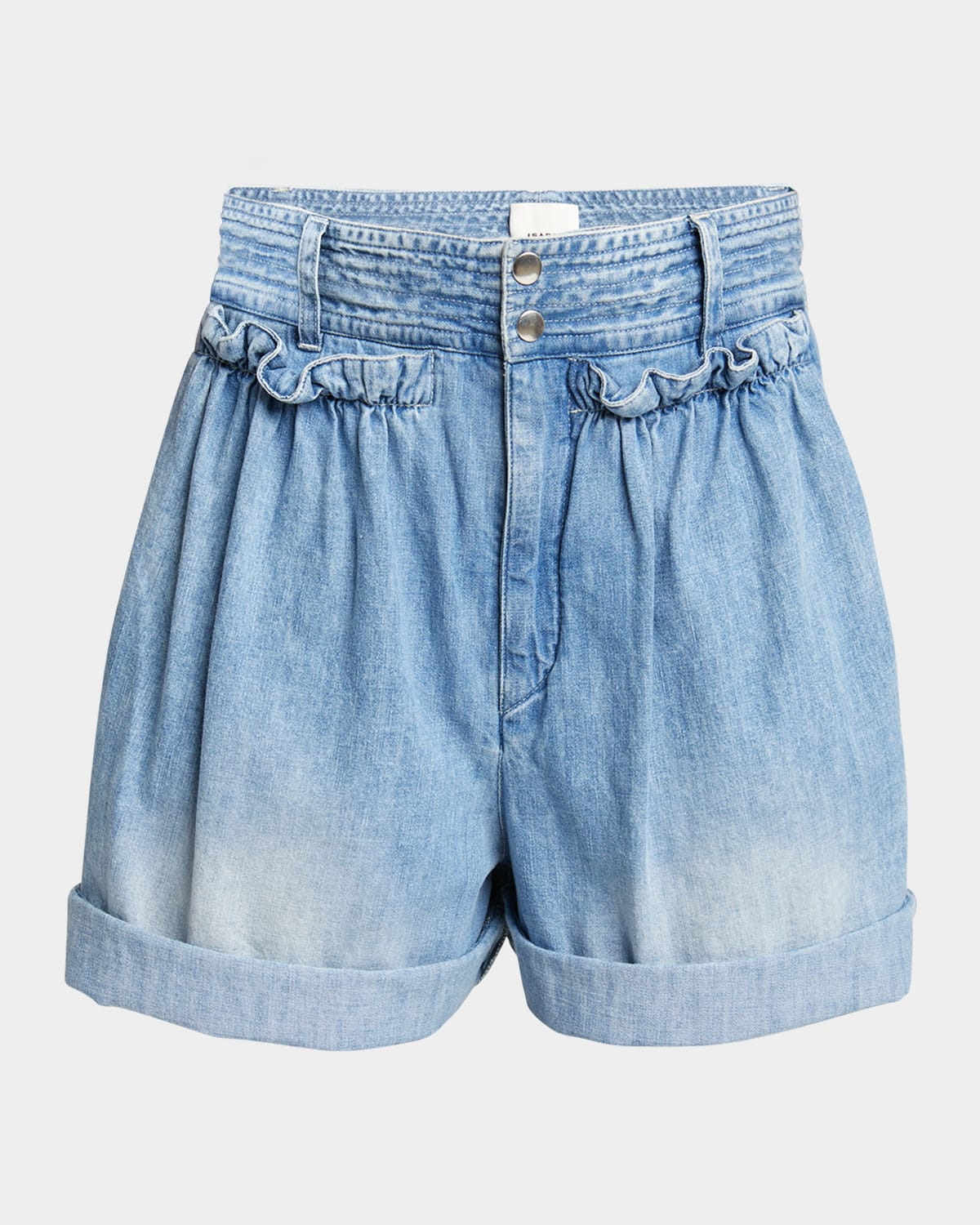 - Isabel Marant "Ingrid" faded light-wash denim shorts featuring ruffle gathered front pockets and a seamed double waistband - Mid rise sits high on hip - Side slip pockets; back patch pockets - Wide legs - Rolled hem - Snap/zip fly; belt loops - Cotton - Imported