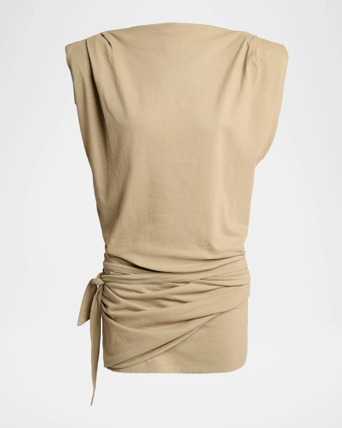 Crafted from cotton jersey, the "Marielle" wrap dress & nbsp;from Isabel Marant features pleated structured shoulders and a wrapped skirt with a side tie High neckline Sleeveless Padded shoulders Sheath silhouette Mini length Slipover style Cotton Hand wash or dry clean Made in Portugal SIZE & FITModel measurements: 5 & apos;10" tallModel is wearing a US size 4/Small