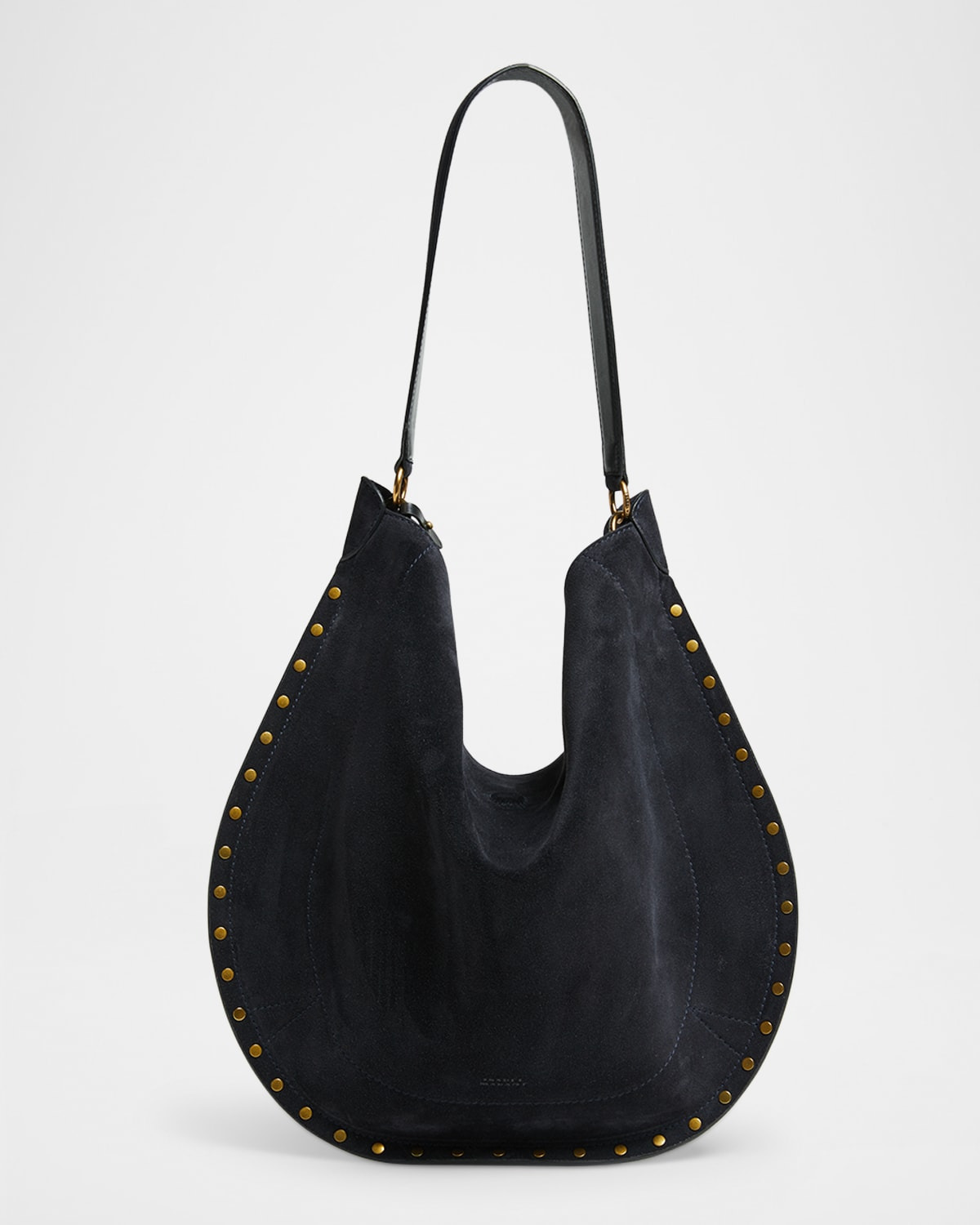 - Isabel Marant "Oskan" soft suede and leather hobo bag with studded trim - Shoulder strap - Fold-over flap top with magnetic closure - Interior, leashed zip pouch - Lining: Cotton - Approx. 14.2"H x 16.5"W x 2.4"D - Spot clean - Imported