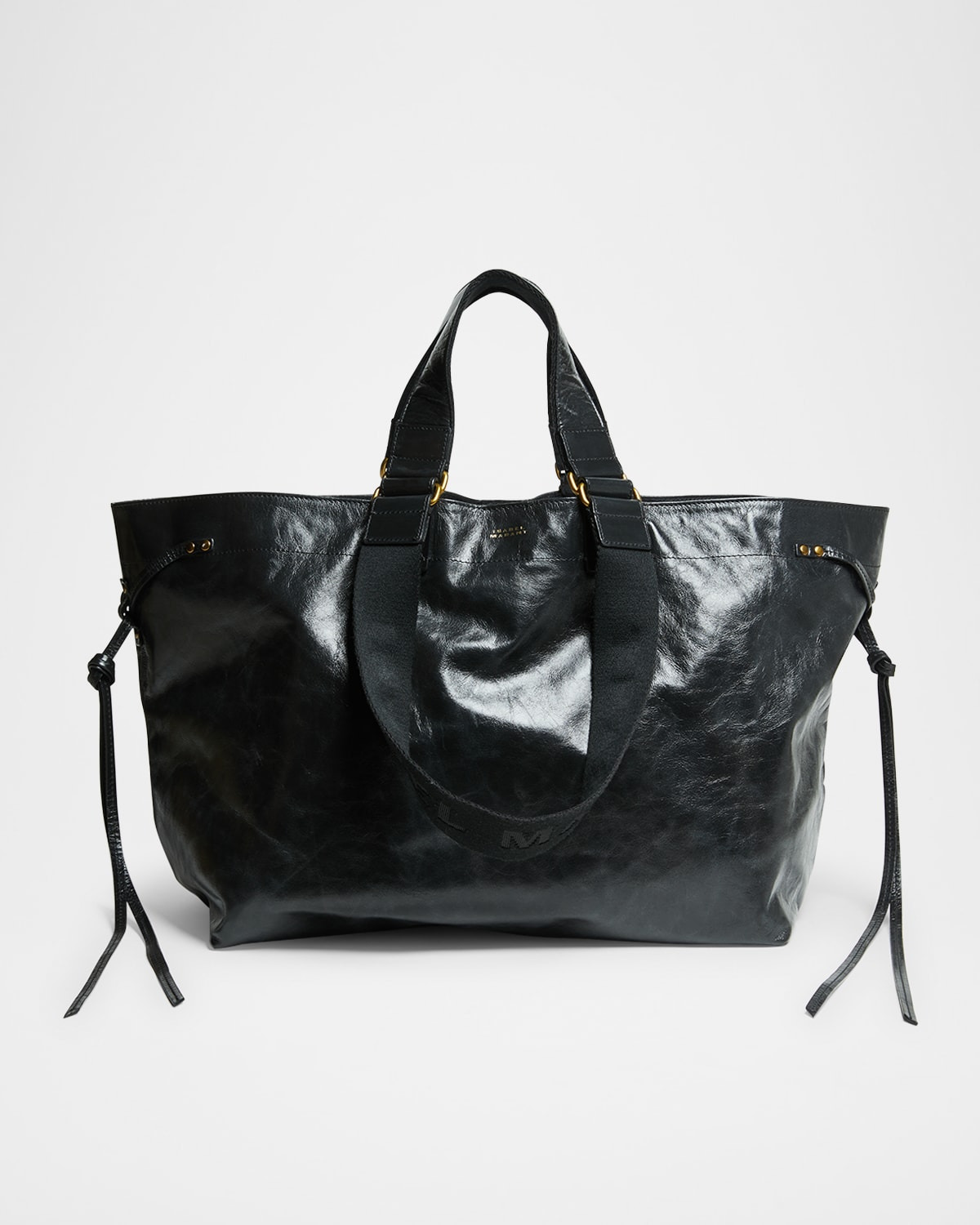 - Isabel Marant "Wardy" tote bag in calf leather - Flat top handles - Flat logo web shoulder straps - Can be worn as a top handle or shoulder bag - Side leather straps - Open top with magnetic closure - Interior, one zip pocket - Approx. 14.8"H x 11.8"W x 7.7"D - Dry clean - Imported