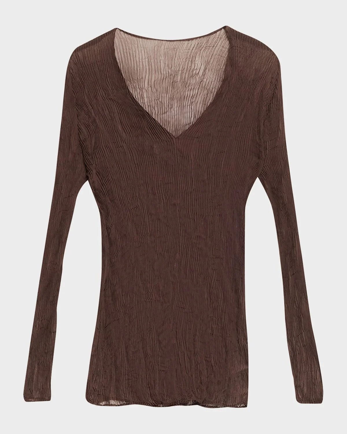 Long-Sleeve Sheer Pleated V-Neck Shirt